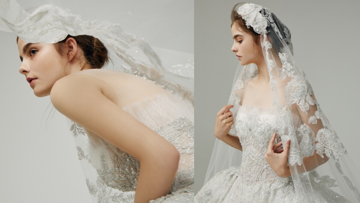 以精緻蕾絲圖騰作為Beatrice婚紗主設計,這件禮服不僅有大褶量的廓形裙擺,上身的馬甲設計更完美雕塑身形曲線,交疊出英國皇室般的貴族氣息。此外,Sophia Ritz也特地採同一蕾絲面料,製作出與禮服搭配的頭紗、袖套和頭飾,可說是變化性極高。