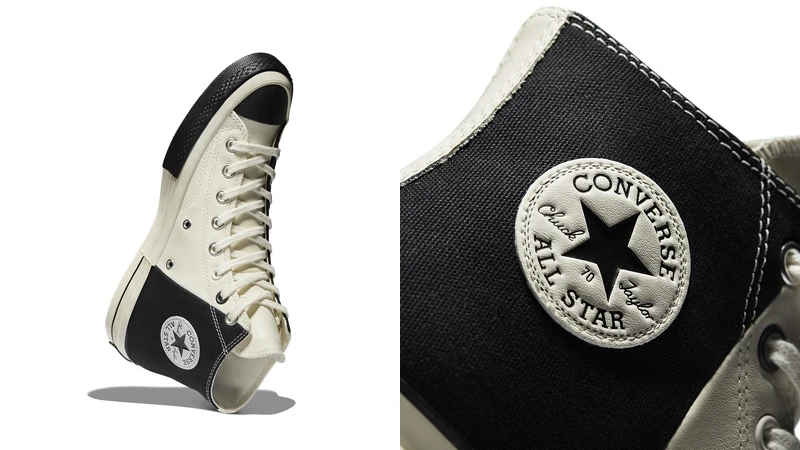 明星鞋款Chuck 70以高筒設計登場,採用黑色拼接白色皮革面料重新組合,後跟鞋標更採用錯位的設計,打造大膽、創新的對比配色鞋款。