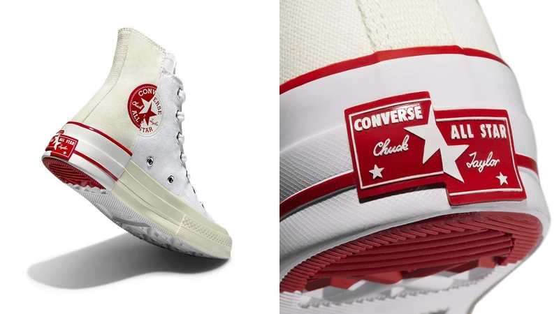 不同於黑白配色的帥氣風格,Converse將Chuck 70採以白色拼接米白色帆布,並將原先的圓形標章改以紅白配色重新詮釋,呈現活潑、俏皮的氛圍。鞋身同樣運用錯位拼接打造而成。