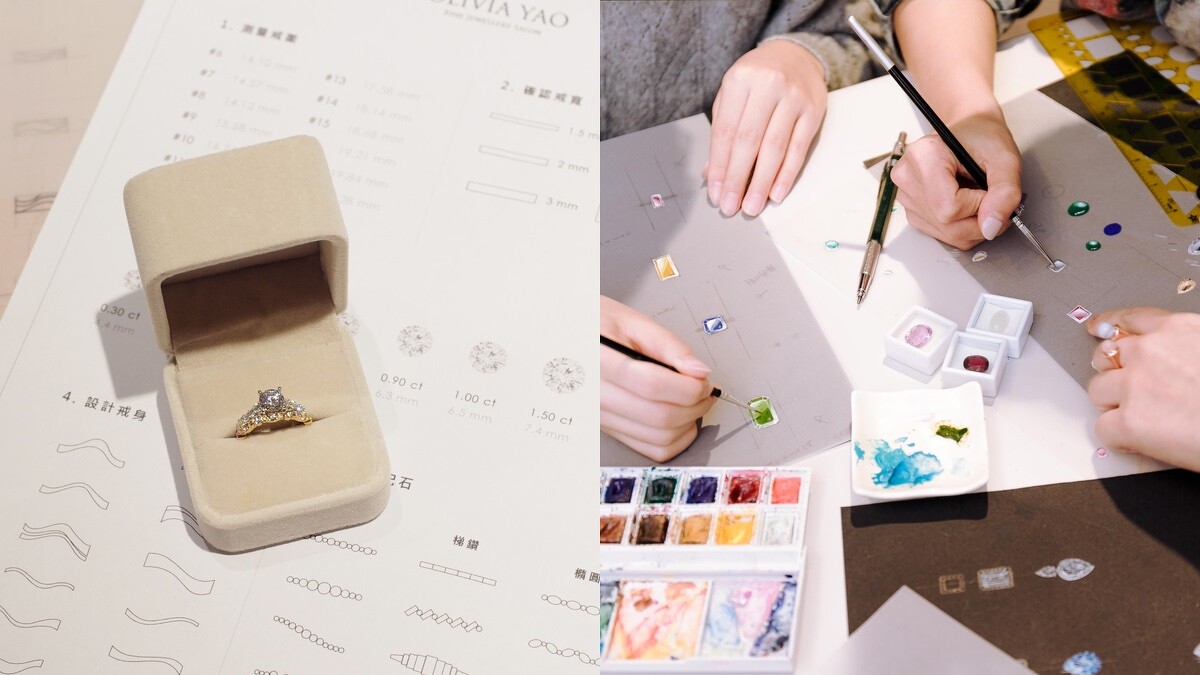 想找尋最適合自己的戒指款式!那Olivia Yao Jewellery提供的婚戒訂製體驗就非報名不可,從戒圍測量、決定主石、設計戒身、顏色挑選到配石設計,加上有專業設計師示範珠寶繪圖技法,讓零設計經驗的你也能親自完成對戒設計圖,打造專屬自己與另一半的對戒。NT2,000起
