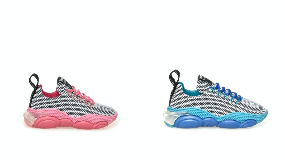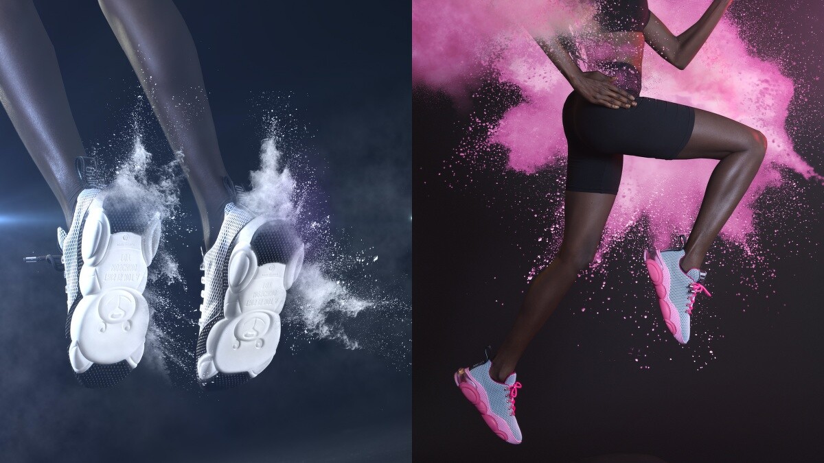 首度於2019春夏系列誕生的熊熊泡泡跑步鞋,以可愛、俏皮的熊熊鞋底,加上舒適、好穿的特點,一推出就廣受女孩們歡迎,成為品牌熱賣的明星商品。2020秋冬Moschino再將跑步鞋進化,推出更加舒適且繽紛趣味的「熊熊泡泡氣墊跑步鞋」。