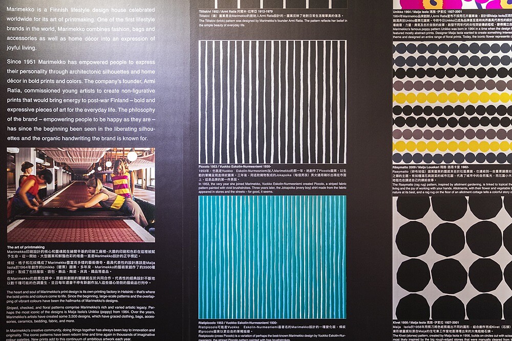 作為第一次參與北緯60度的芬蘭設計展-luonnonläheinen elämä,Marimekko特地從芬蘭總部直送服飾、布品及家飾等,包含品牌經典Unikko印花、Kivet(石頭)和Lokki印花,以及最新春夏登場的Pioni (牡丹 ),Ristipiccolo及Piccolo印花,並從1960年到1970年中Marimekko的印花圖庫裡精選花卉。