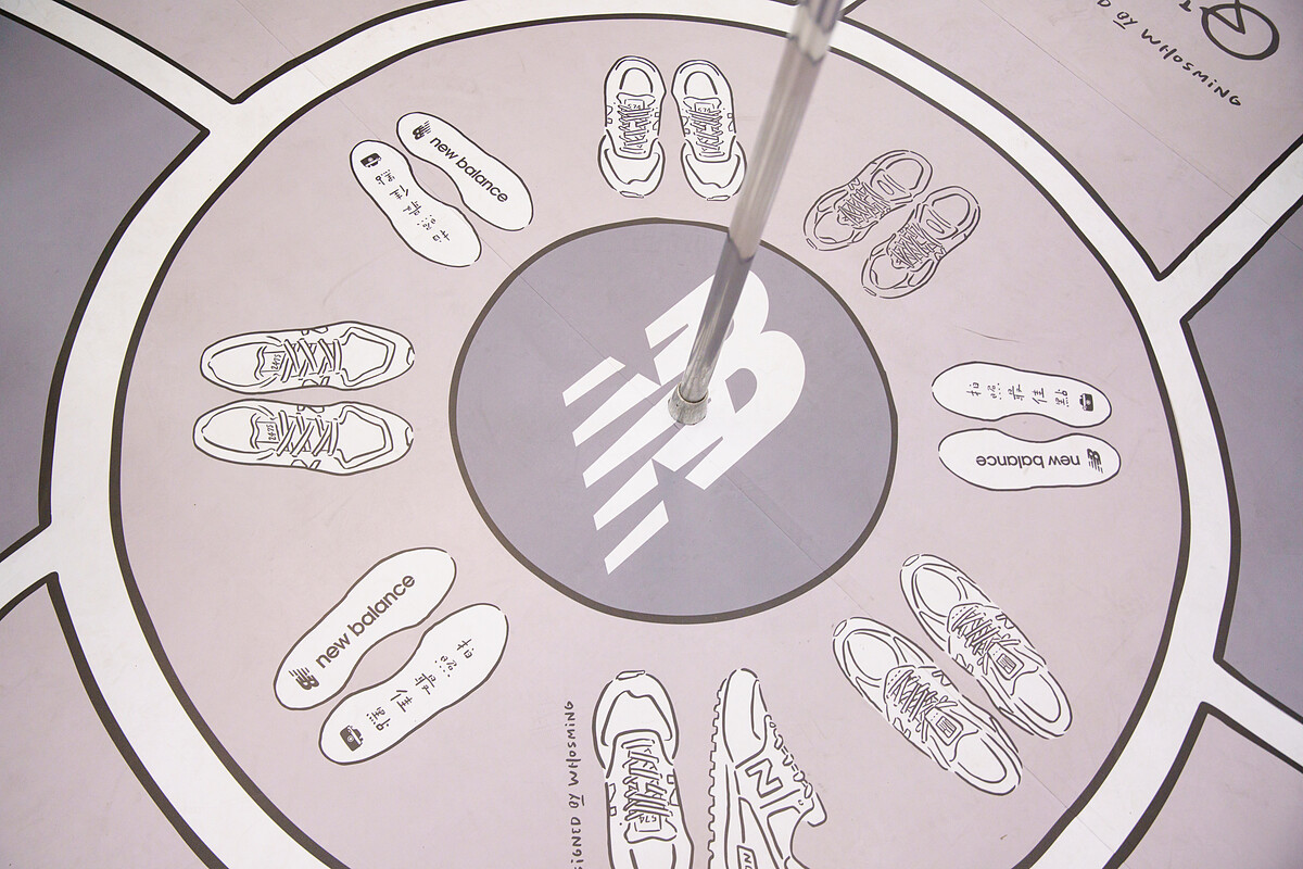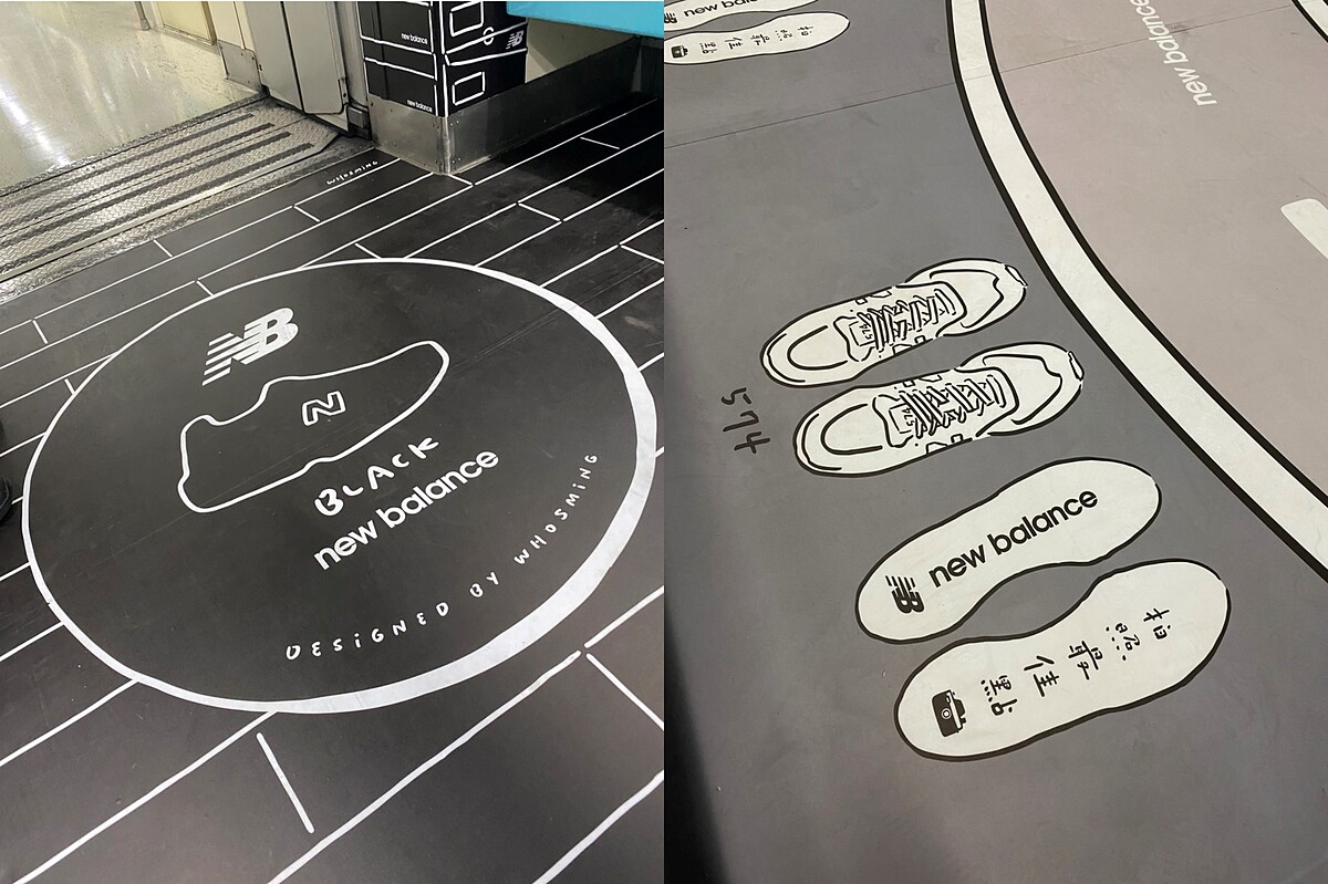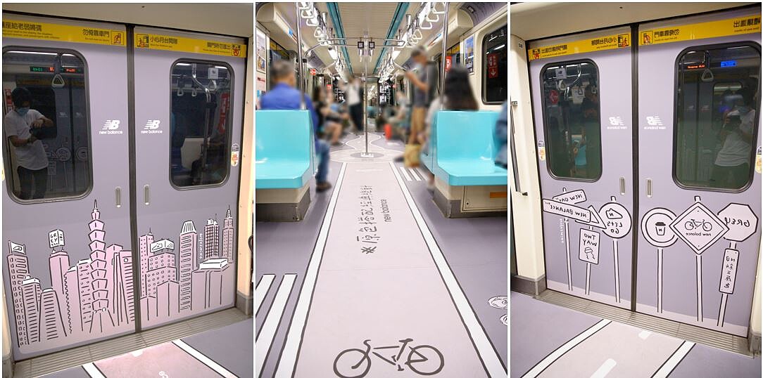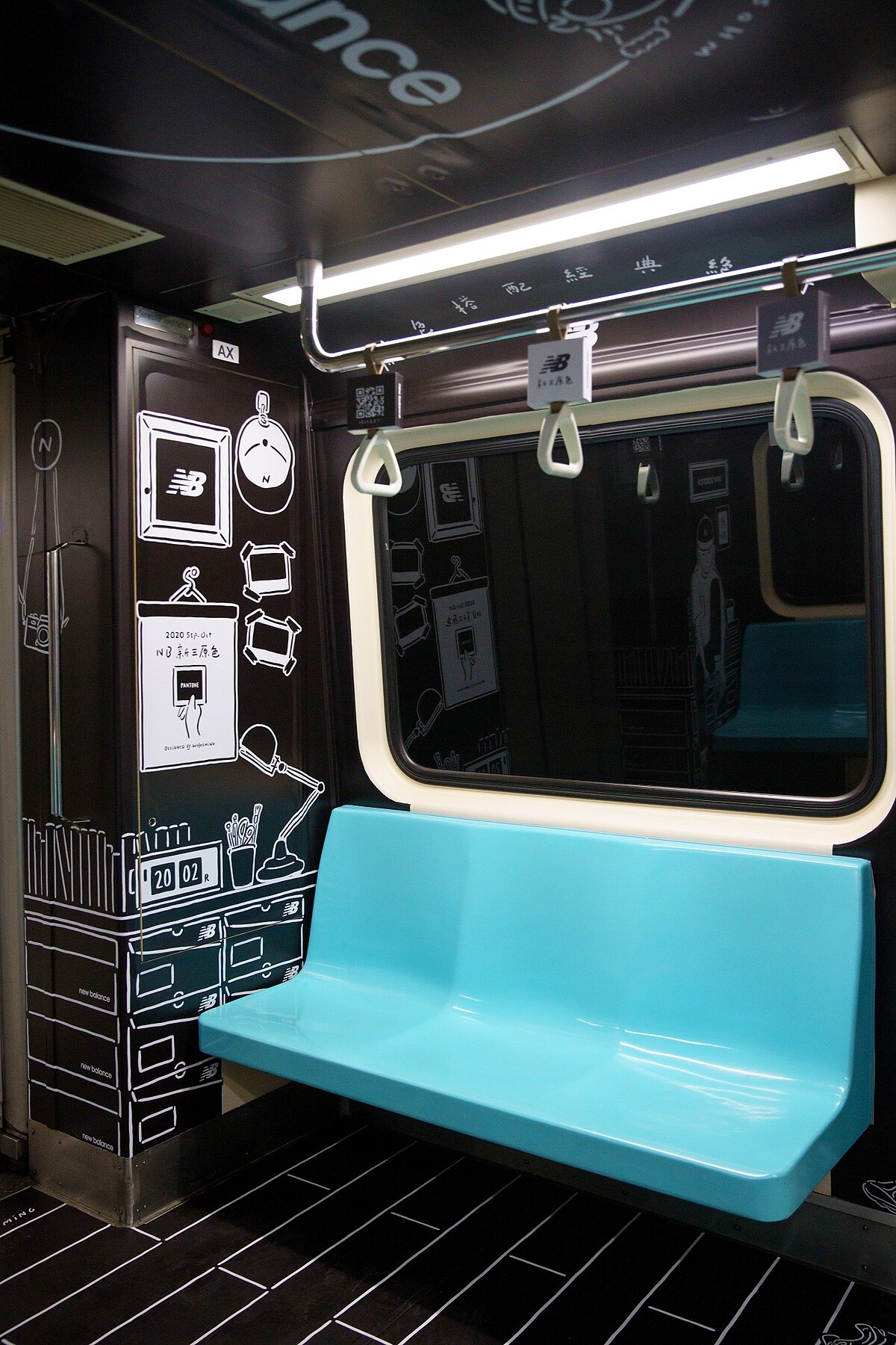 另外,從車門、地板、牆面、吊環、一路到天花板都可以看到大面積的藝術設計,並穿插New Balance不同型號「新三原色」鞋款的特色插畫。New Balance特別貼心附上QR Code,方便大家用手機掃描、研究喜歡的鞋款資料,下車後就可以直接入手自己愛的New Balance鞋款,貼心指數100%!