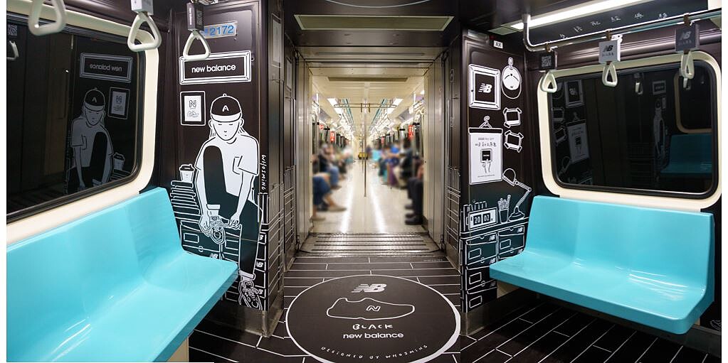 又潮又酷的期間限定的黑白灰主題車廂,將NB「新三原色」黑、白、灰,融入許多日常生活場景的創作,加上從天花板、車廂壁面、地板、把手…等區,都以創意巧思轉化為捷運車廂內的2D裝置藝術。