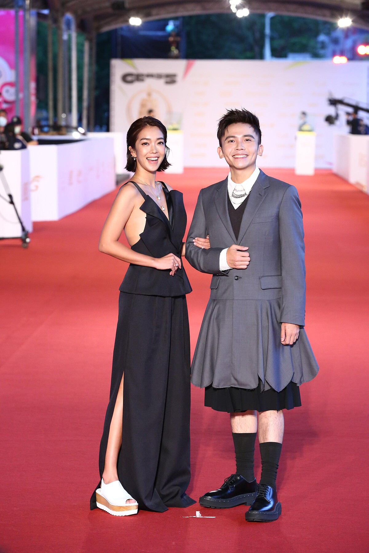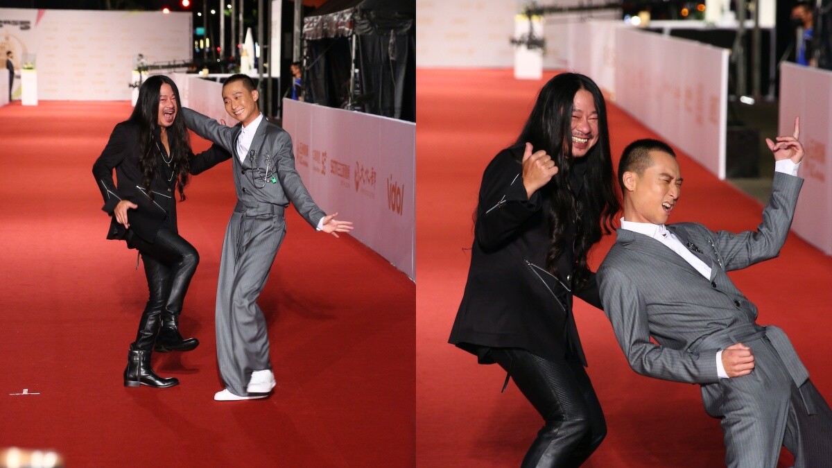 紅地毯最甜美CP,亂彈阿翔選擇立體剪裁的拼接外套,配上緊身皮褲、亮皮皮鞋,搭配銀色垂吊飾項鍊,散發著濃濃搖滾魂,而與他一同走上紅地毯的浩子,則選擇灰色的短版西裝外套及高腰寬褲,搭配與阿翔相似的垂吊式配飾。