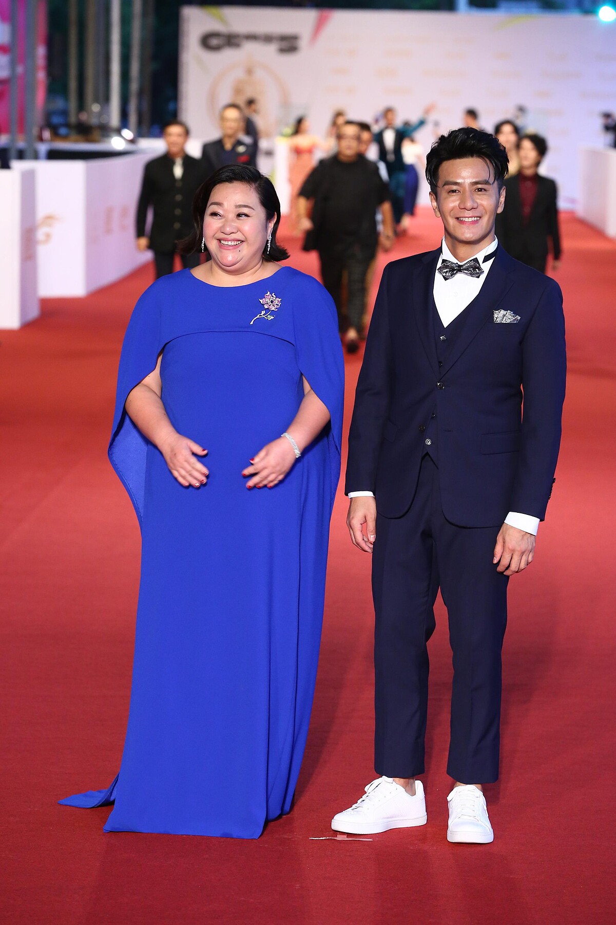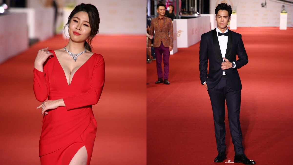 紅毯最美長腿非白家綺莫屬!今年選擇亮紅色晚禮服出場,深V設計加上高開衩長裙,完美展露白皙長腿。而走在一旁的Gino,這回選擇經典的黑色西裝,搭配黑色的蝴蝶領結,整體有種歐式風格的男人魅力。