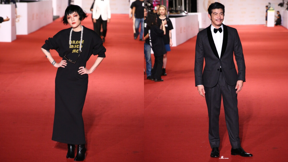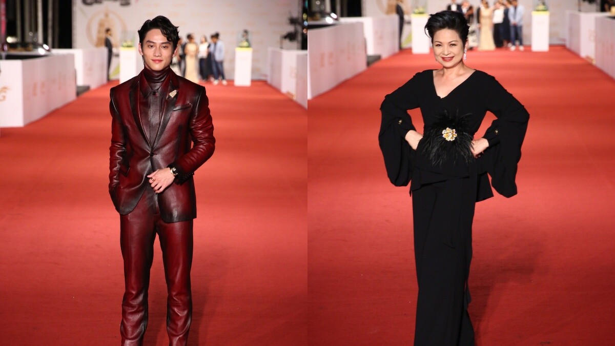 國民男友的范少勳選擇Berluti酒紅色皮革西裝上場,細看西裝可不單調,以仿舊效果處理的皮革打造相當搶眼。另外,楊貴媚則選擇一套黑色套裝亮相,腰間繫上金屬花朵配件,呈現高雅俐落的現代美學。