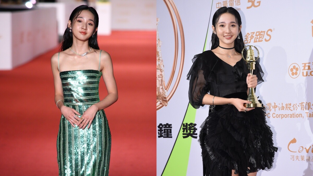 拿下戲劇最具潛力新人的李沐,以亮片平口細肩帶洋裝登上紅毯,獲獎時則穿上香奈兒2020春夏系列中黑色烏干紗荷葉邊上衣、黑色烏干紗與拉菲草多層次短裙,展現截然不同的女神氣質。