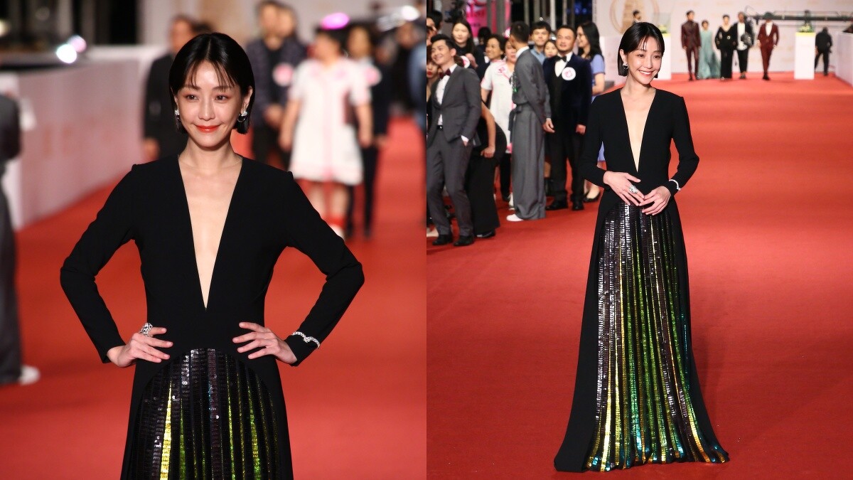 穿著深V低胸禮服登場的謝欣穎,低調的黑色系點綴亮片材質的設計,成功奪取在場每個人的目光,同時也展現她氣質、典雅的一面。