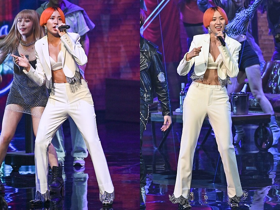 和Ozi表演時,9m88換上了來自Net-A-Porter AREA的白色軟呢流蘇裝飾套裝,堅挺的肩線不但顯得帥氣有型,搭配的白色小背心更添性感氛圍。