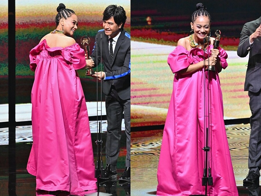 榮獲最佳原住民語專輯獎的阿爆,在典禮換上了一襲桃紅色荷葉領A字型禮服,並戴上了民俗風的編織項鍊,展現展現甜美卻不失個人風格的時尚品味。