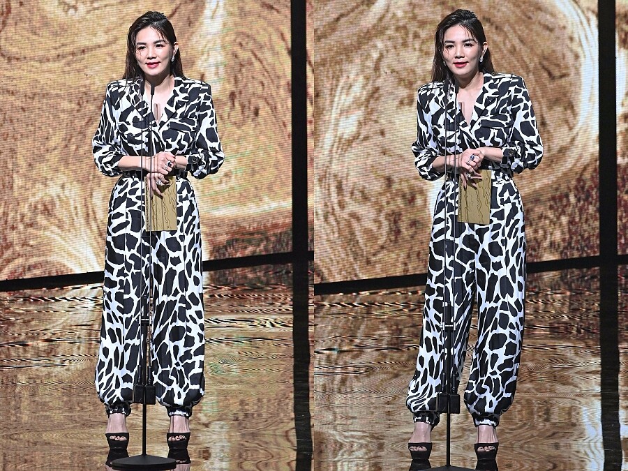 以頒獎人身份出席金曲典禮的Ella,選擇穿上黑白色動物紋連身褲裝,色彩簡單卻足以吸睛,並以墊肩和V字領的襯衫領口襯出女性獨有的氣質美。