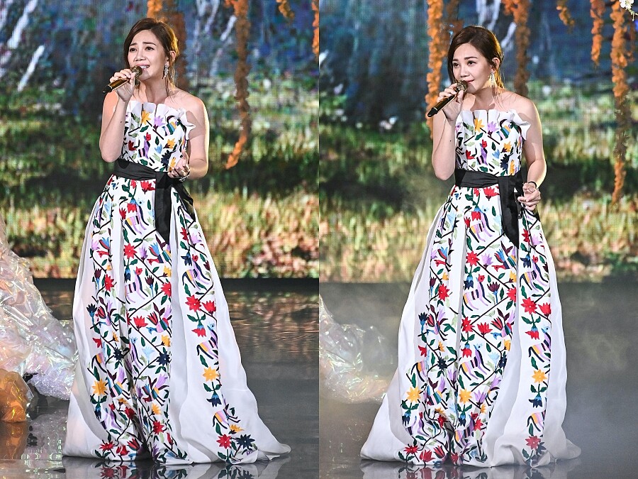 不但入圍最佳國語女歌手獎,情歌天后梁靜茹更為大家獻唱多曲經典曲目。表演造型以貝殼般的弧線領和印有繽紛花卉的禮服站上舞台,動人又優雅。