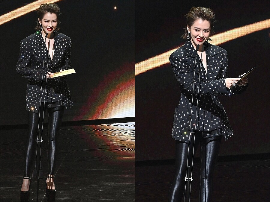 作為本屆金曲獎的頒獎人之一,徐若瑄選擇穿上Oversized墊肩領水鑽西裝外套,並搭配皮革Legging,透過上寬下窄的造型髮突顯霸氣的態度與完美身形比例。