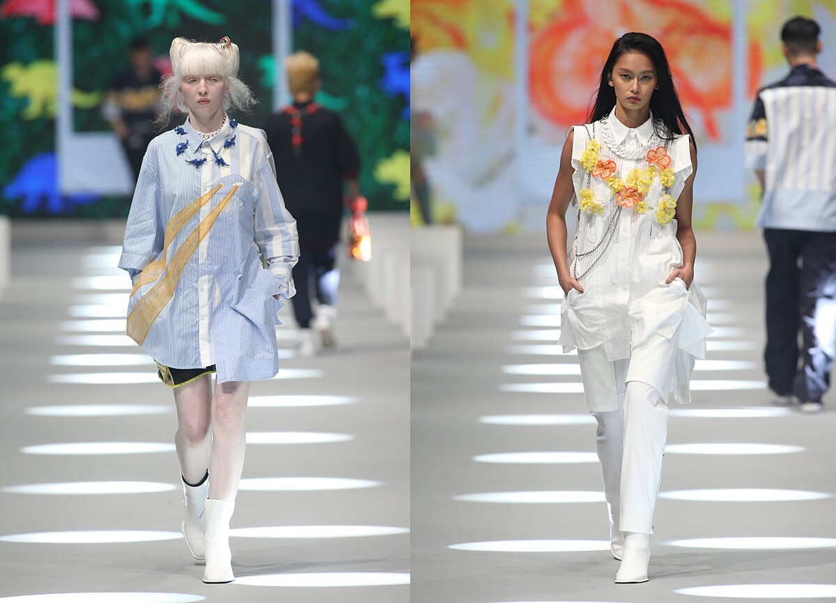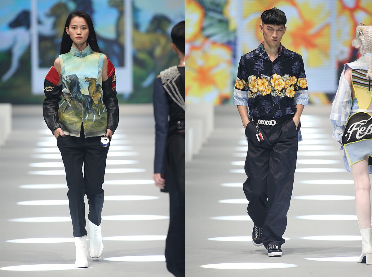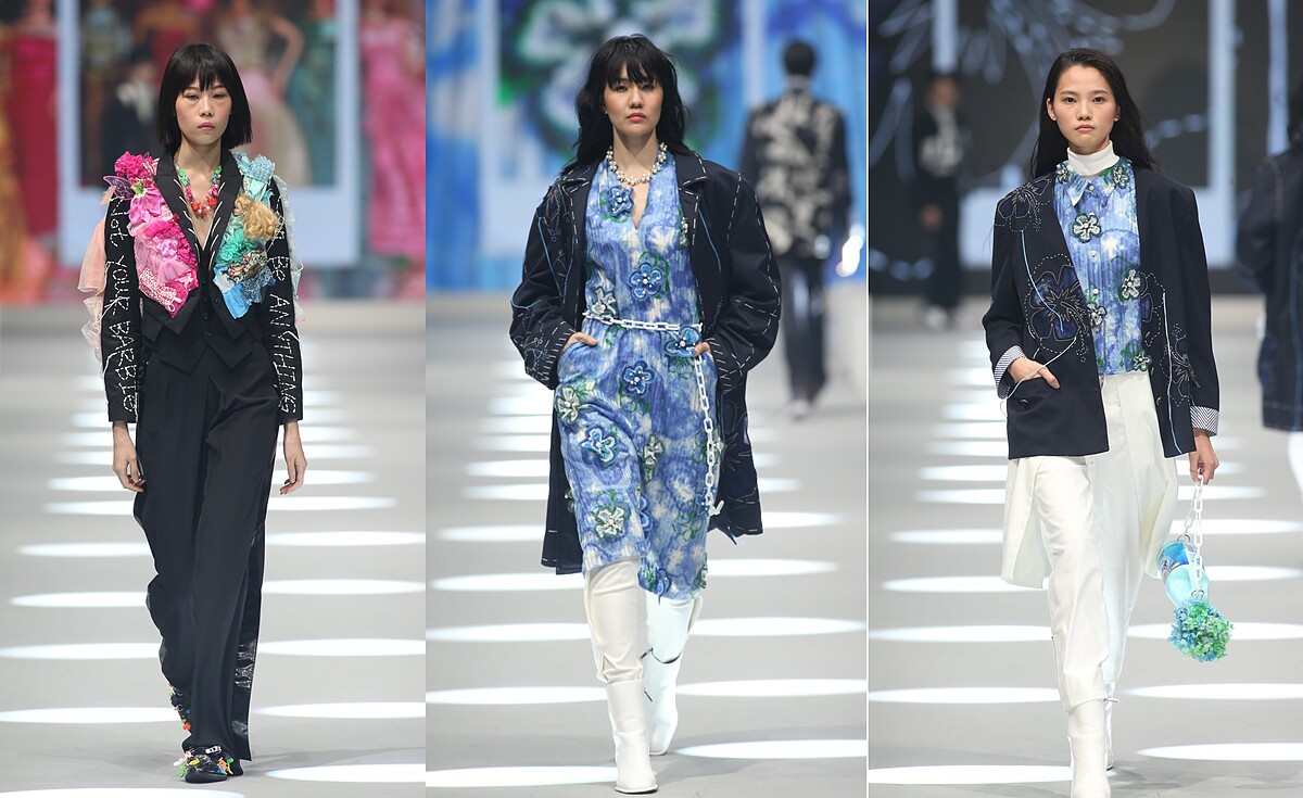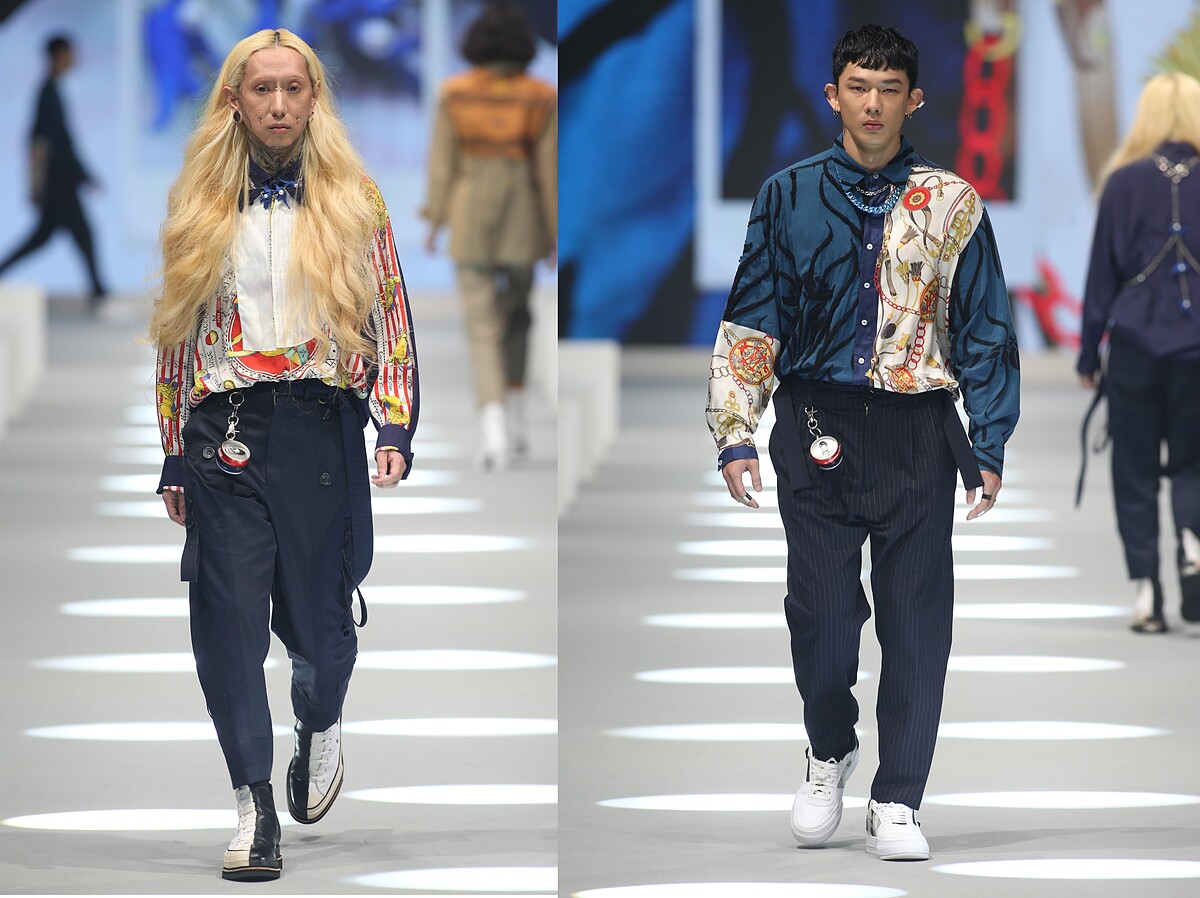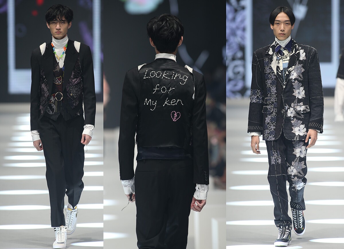 以休閒感十足的舊夏威夷襯衫改造做為主要設計,藉此滿足被疫情悶壞想出國渡假的心情;並以雙層防水半透明的環保紙夾乾燥花創新獨特的永續面料質感,製做成服裝與配件,呈現出時間靜止、讓花期永遠保鮮的意象;更與新北市玩具銀行合作,從大眾不要的二手整新玩具中揀選出三大袋的各式玩具作為媒材,包含舊的芭比娃娃與恐龍公仔,運用芭比娃娃的衣服重新染製改造成真人穿尺寸的衣服,把恐龍公仔反差組合珍珠串成首飾,完美體現讓廢棄物華麗轉生再利用的環保概念。