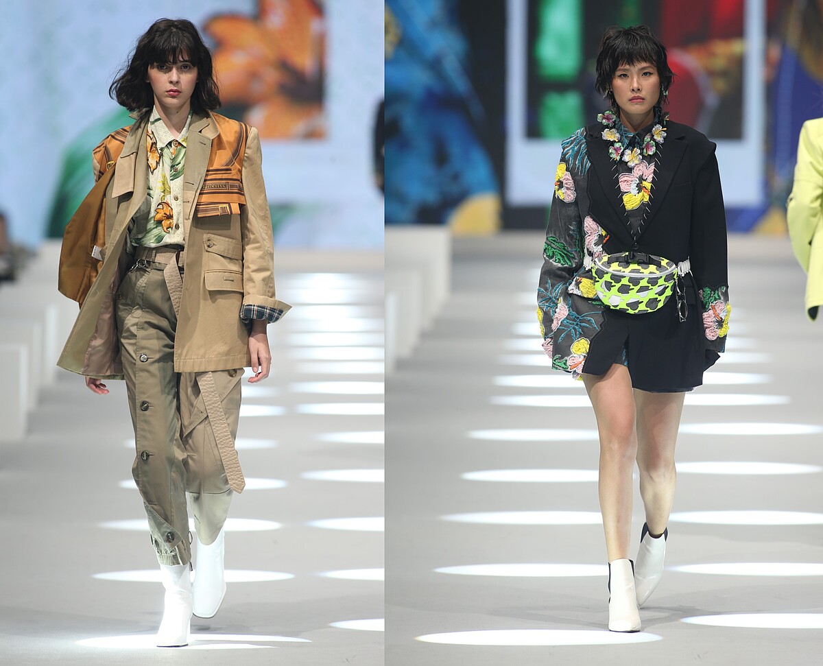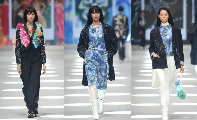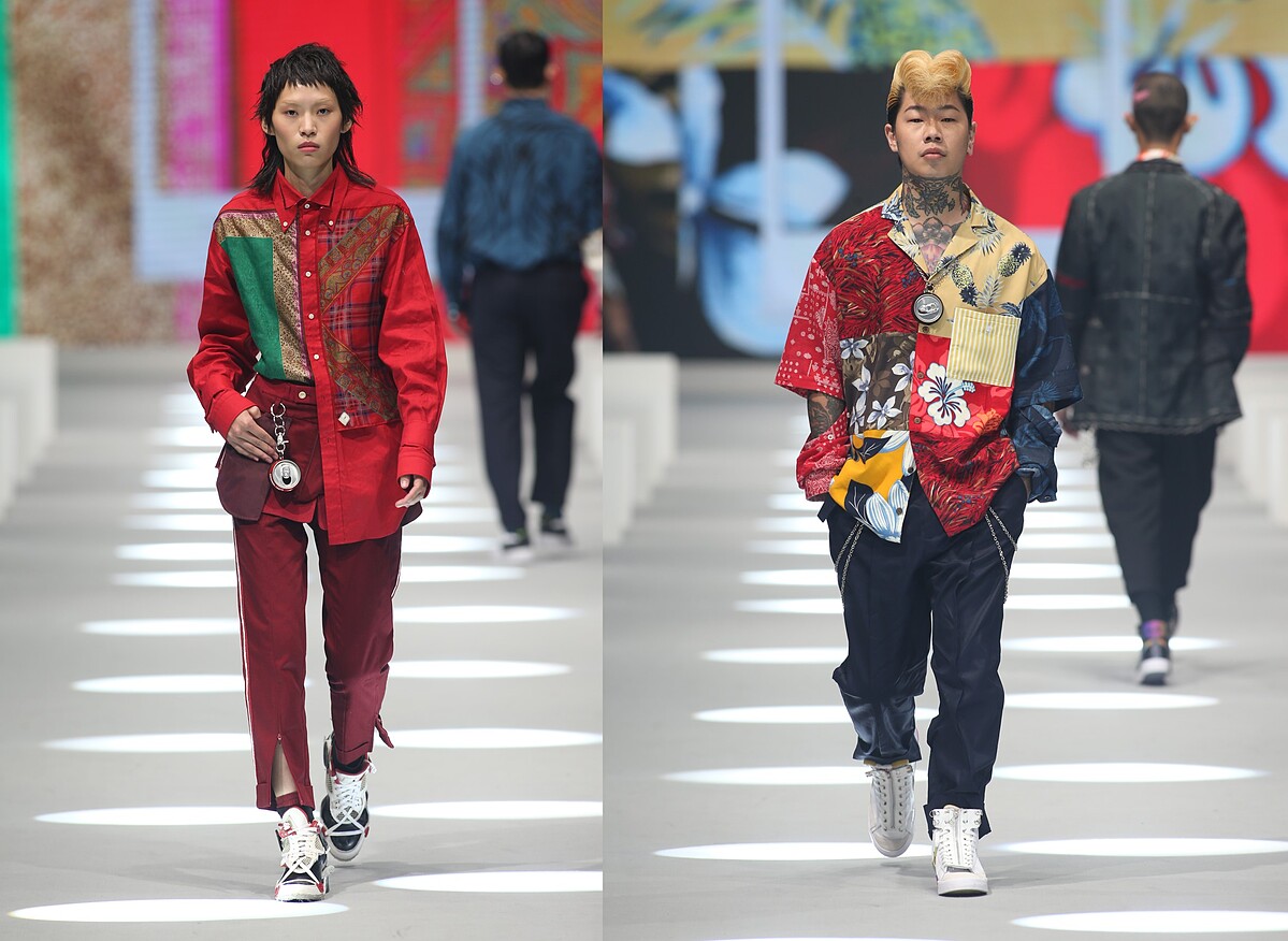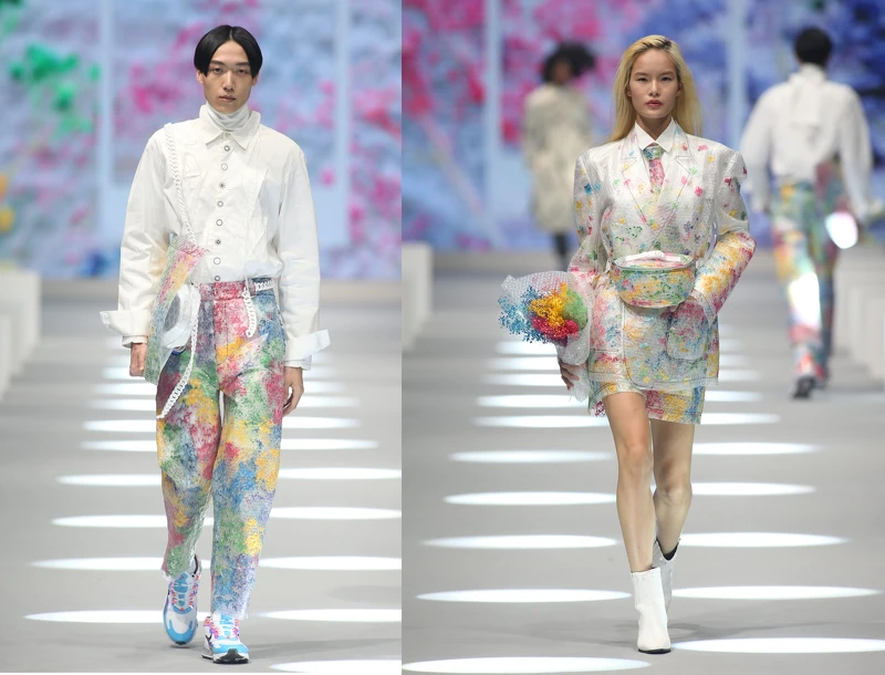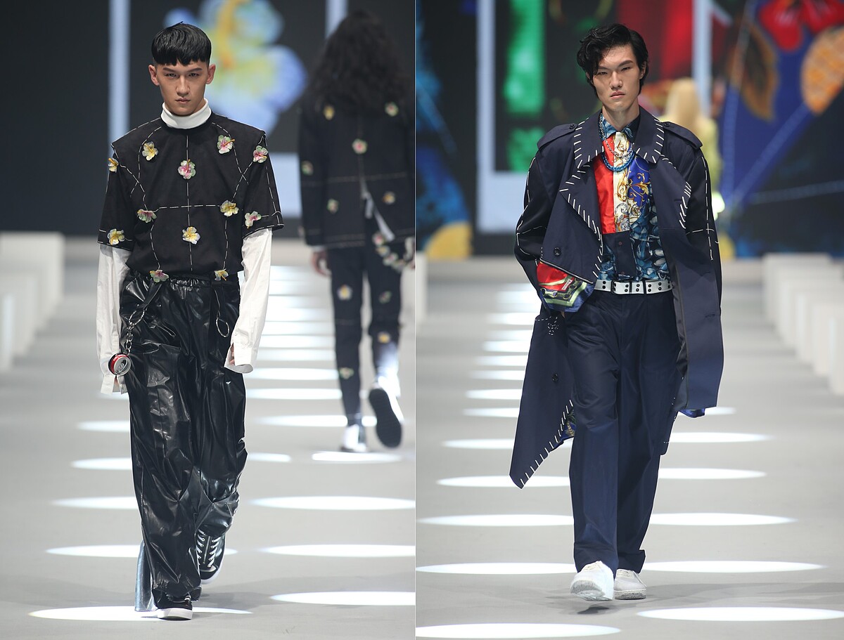 以休閒感十足的舊夏威夷襯衫改造做為主要設計,藉此滿足被疫情悶壞想出國渡假的心情;並以雙層防水半透明的環保紙夾乾燥花創新獨特的永續面料質感,製做成服裝與配件,呈現出時間靜止、讓花期永遠保鮮的意象;更與新北市玩具銀行合作,從大眾不要的二手整新玩具中揀選出三大袋的各式玩具作為媒材,包含舊的芭比娃娃與恐龍公仔,運用芭比娃娃的衣服重新染製改造成真人穿尺寸的衣服,把恐龍公仔反差組合珍珠串成首飾,完美體現讓廢棄物華麗轉生再利用的環保概念。