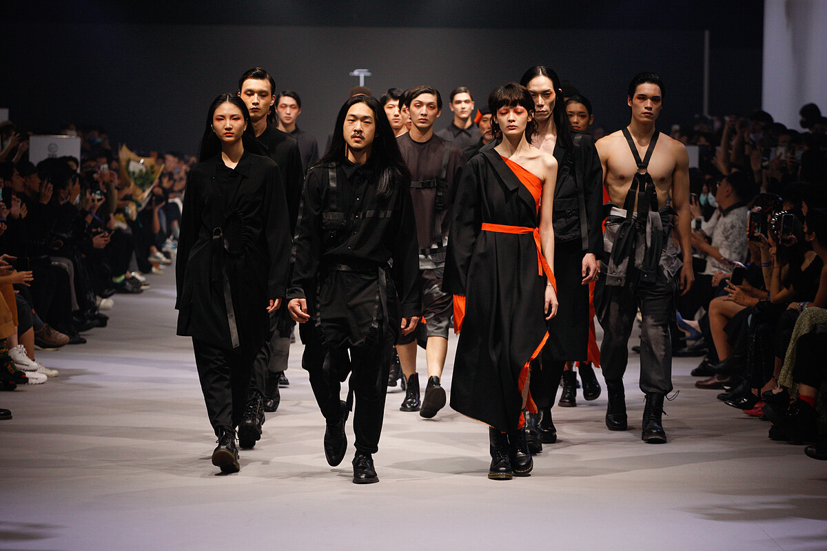 延續過往一貫的強烈暗黑風格並強調永續設計,擅長玩轉服裝結構,用建築思維打造出脫俗的時尚服裝,設計上更訴求著打破框架、性別與思考,透過呈現柔美男性面和強悍女性面製造出中性哲學;至於時尚界所關心的永續,郭瑋則認為除了品牌回收舊衣再造等企劃外,更應該從設計發想就開始貫徹,讓一衣可以三、四穿,賦予單品一件精品以上的價值,提高功能與實用性的多元運用,而不是穿膩即拋,郭瑋表示:「當看到品牌愛好者在五年後還穿著同套服裝,真的覺得很感動。」在不斷嘗試新的設計方法與反覆地實驗,INF順利孕育出突破以往的嶄新作品,也讓人對郭瑋日後的作品更為期待。