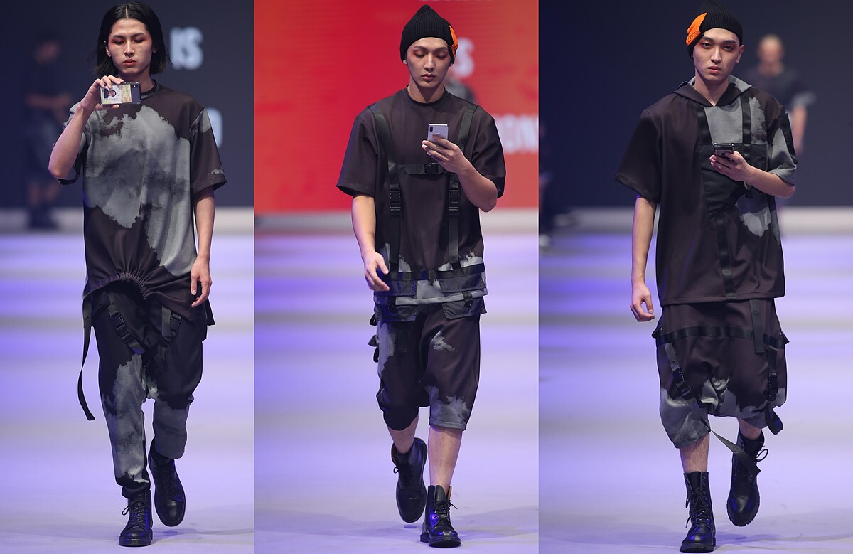 除此之外,INF更與LINE台灣合作,將LINE傳統的藍天白雲背景圖轉化調色、配合對話框印刷於服裝上,呈現出被已讀不回的趣味感,同時也為向來以暗黑調性為主的品牌精神注入了全新色彩,重新定義「暗黑」二字;走秀表現上更是前所未有地讓模特兒滑著手機出場、亦錄亦拍,饒富趣味性、顛覆時裝秀傳統,配合由伊林專業模特兒釋放藏於外套中的大型降落傘,以及變形成包包的西裝外套,整場秀宛如一場充滿街頭反諷及高機能性的大型行為藝術。