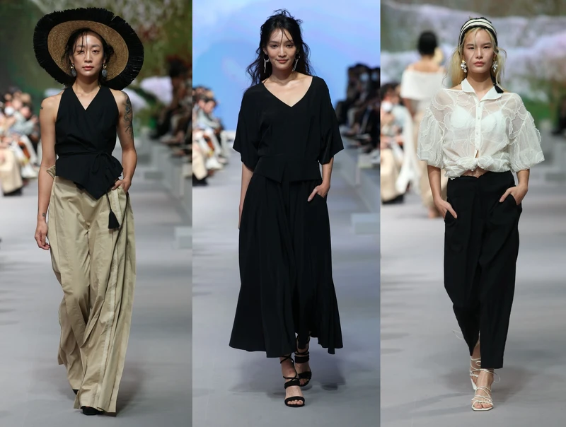 設計師蔡宜芬以緹花面料作為主軸,在透紗跟舒棉材質上可以看見蝴蝶、花朵、不收邊等裝飾細節點綴其中,同時也維持了簡約的線條,在修飾穿搭者的身形比例表現上也十分出色,除此之外還有種兼顧了華麗浪漫風情的實穿性融入其中,整體顏色使用上則鍾情於米色和綠色等大地色系的搭配,完全是當代女性最喜愛、最想選擇的那一種舒適時尚感。