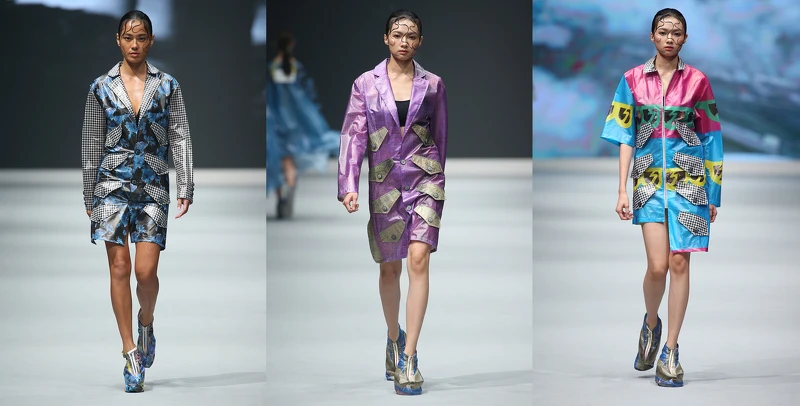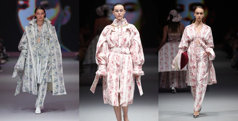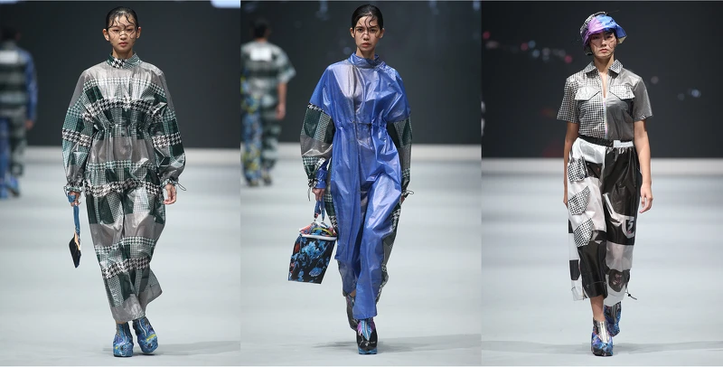 作品中可以看到將家飾布料、牆紙印花、家具廓形等,應用在本季設計上,將家飾變成時裝、呼應因疫情宅在家的時間變長,打破傳統居家與外出的界限;無階級人們搭建帳篷、茅屋轉化在洋裝設計上,裙面上加上帳篷骨架,撐起創造出異常的輪廓,彷彿皮膚因輻射影響產生的病變組織,鬆開骨架後服裝自然垂墜,展現版型效果,變回的 One-piece 洋裝。