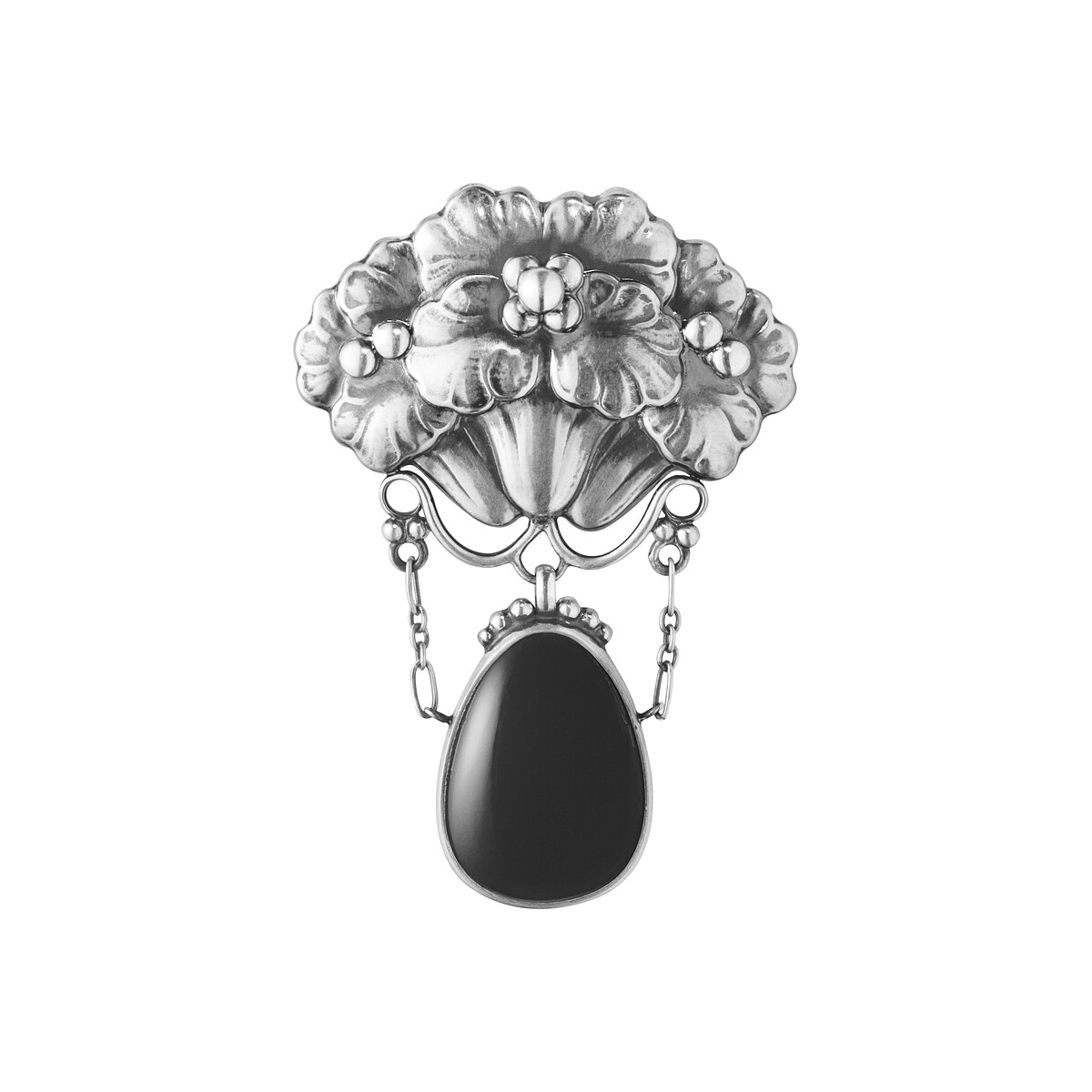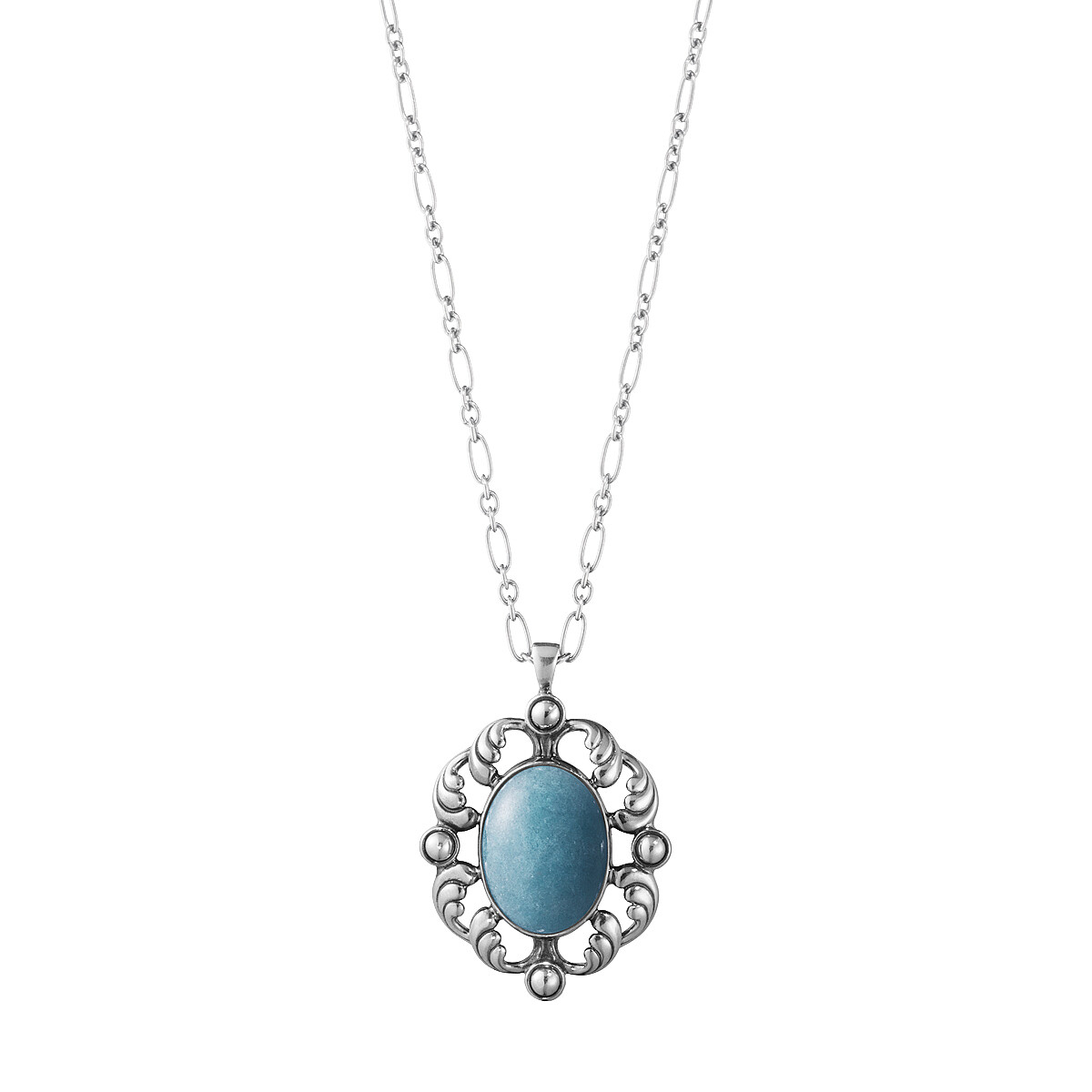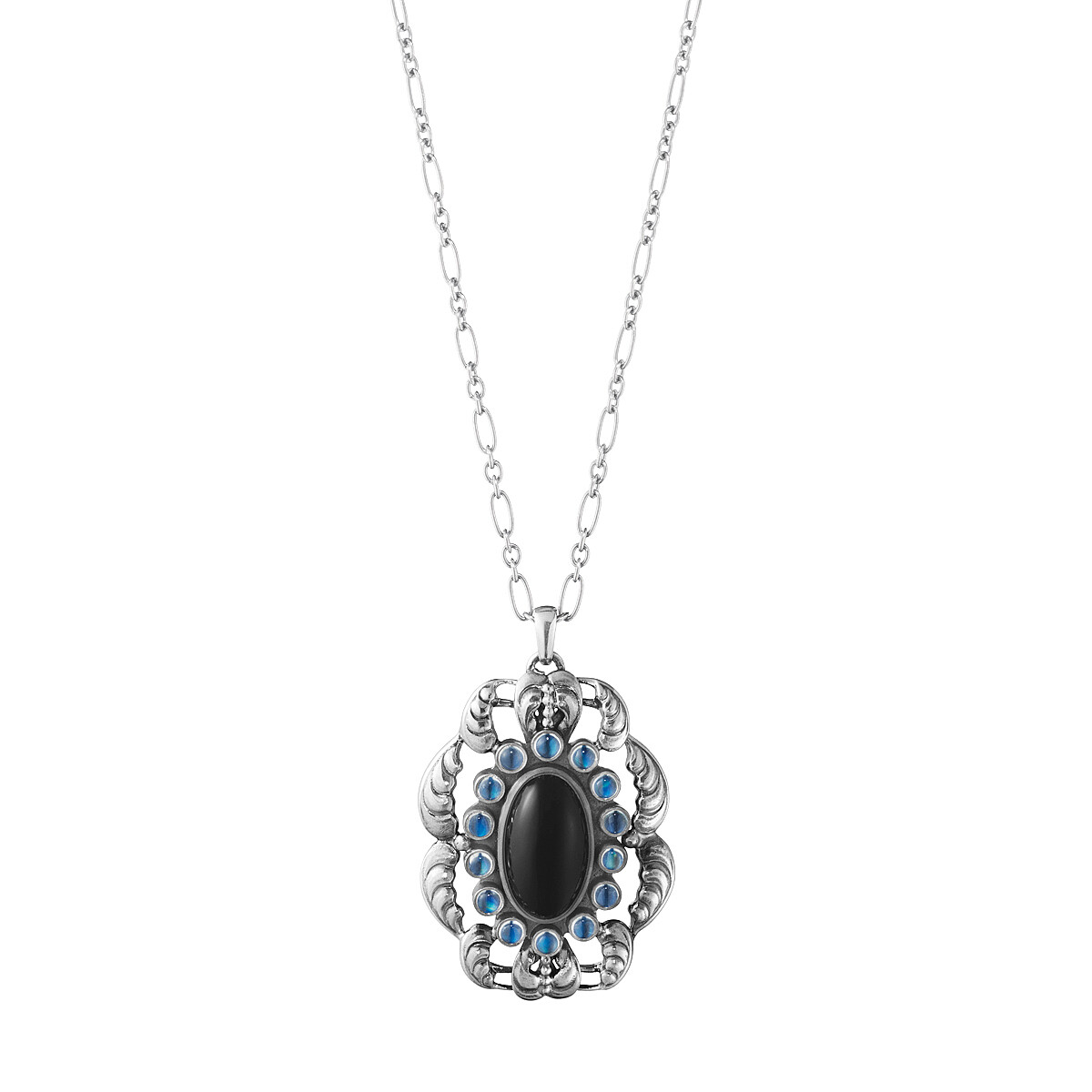 以長橢圓形黑瑪瑙為中心,周邊綴飾一圈藍色月光石,鍊墜最外圈以硫化處理純銀材質打造出立體花卉曲線,是品牌繁複細膩的工藝與古典氣息的最佳代表作。