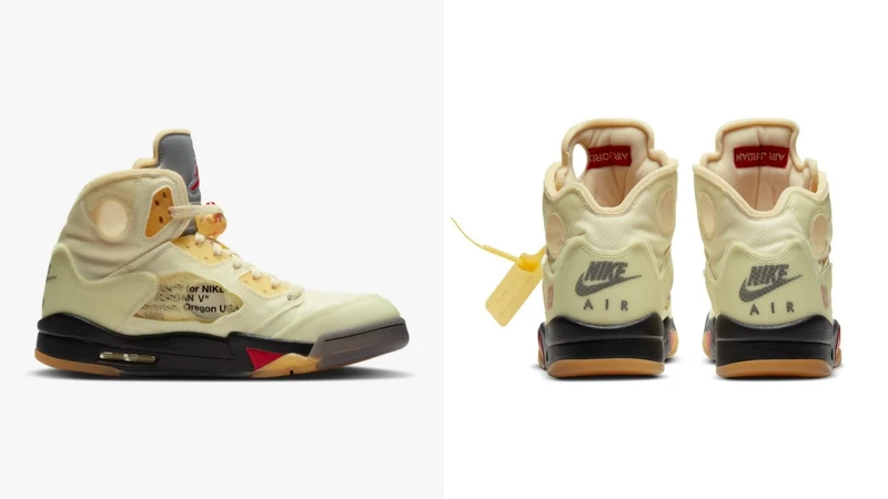 由Off-White創意總監Virgil Abloh所打造的Air Jordan 5 Retro SP鞋款,延續Off-White獨特的解構美學,像是隕石坑設計、Off-White標誌性束帶,以及文字標語等,並於鞋側印上Michael Jordan的招牌數字「23」以示尊敬。