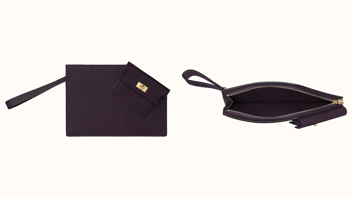 由凱莉包進化的Kelly Pocket To Go系列於2019年秋冬系列中首度問世,不同於一般手拿包方正的外觀,Kelly Pocket To Go Pouch缺一角的造型更顯獨特,貼心配置方便攜帶的短皮革環圈,可以直接掛在手腕上,或是當成手拿包攜帶,包袋可放入手機、鑰匙、耳機等隨身物品,包身外還設計了一個外口袋。