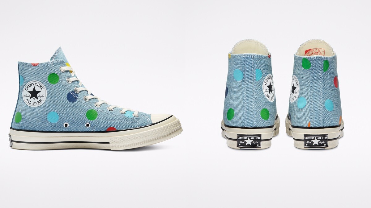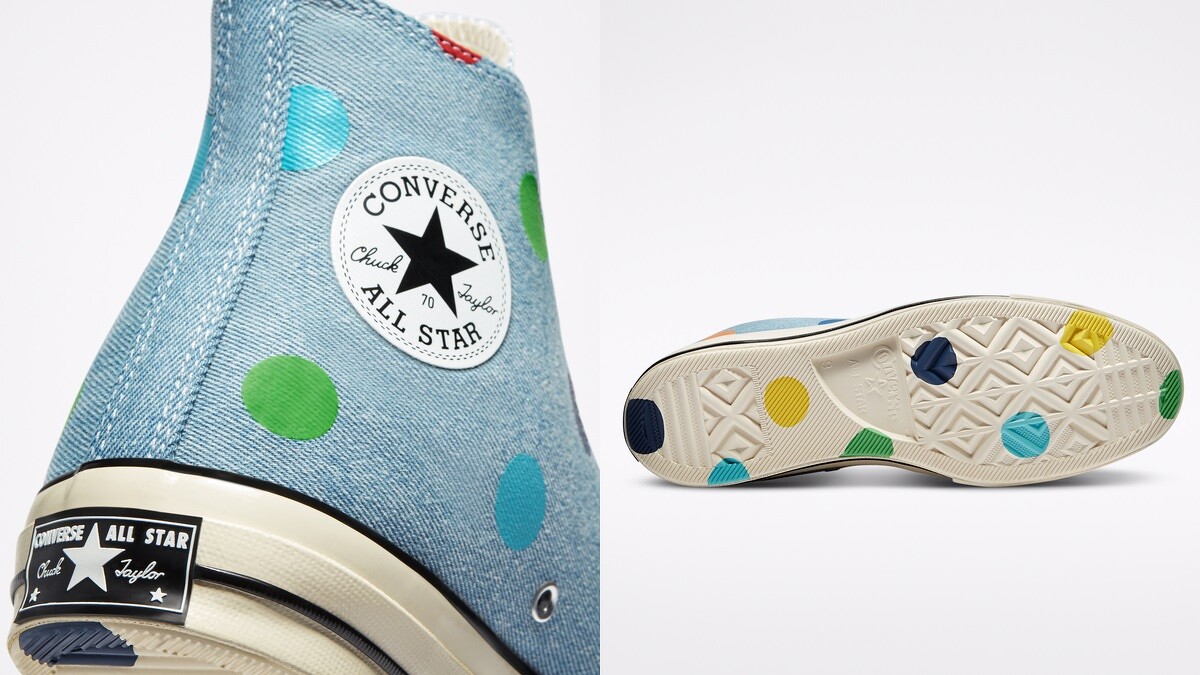 Tyler, The Creator選用水洗感牛仔布代替經典帆布,以2016年Golf Wang在首個時裝週秀場上所運用讀彩虹圓點覆蓋外部鞋面和鞋底,繽紛活潑的點點元素、獨特的牛仔布鞋面、Golf Wang的古怪幽默,一雙輸是耐穿又獨特的Chuck 70就此誕生。