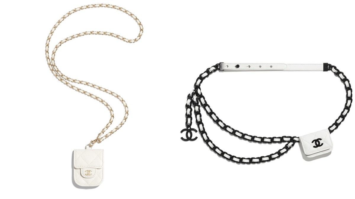 近年來很夯的Airpods保護套也沒錯過,加入香奈兒標誌性的菱格紋,分別有腰鍊、頸鍊兩種不同選擇。
