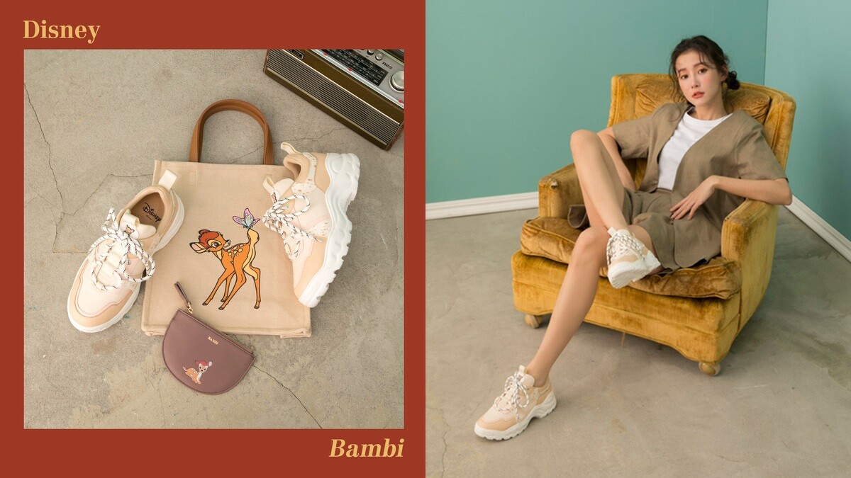 選用女孩們喜愛的奶茶色,推出全新小鹿斑比聯名單品,除了小鹿斑比圖案造型托特袋,還推出時下流行的老爹鞋款。