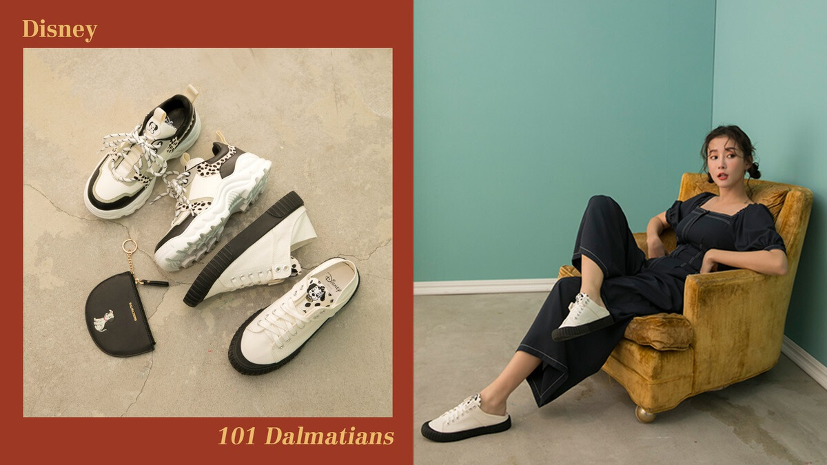 101忠狗聯名商品以卡通中代表的黑、白色,並將角色身上的波卡圓點注入設計,推出拼接老爹鞋、半圓零錢包,以及女孩必備鞋款餅乾鞋。
