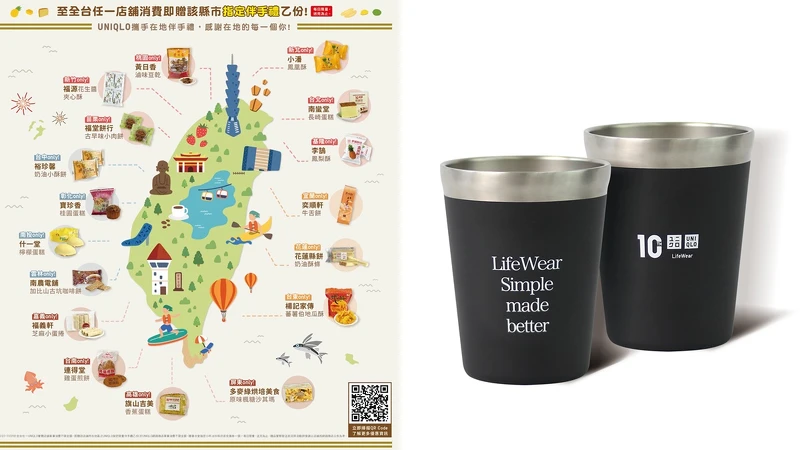 於Uniqlo感謝祭前3日前往實體店鋪消費,不現金額就能獲得Uniqlo聯手全台17縣市一同打造的在地特色伴手禮,像是在台北就能獲得南蠻堂長崎蛋糕、新北有小潘鳳凰酥、新竹福源花生醬夾心酥…等,另外,消費滿2千即可獲得質感破表的LifeWear金句保溫杯、滿3000送優惠卷300。