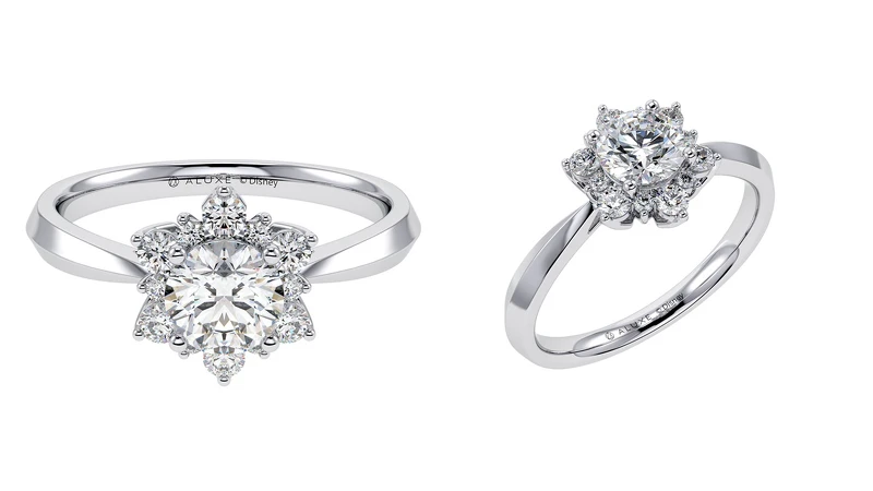 以冰雪奇緣兩位主角信念與堅定的愛為靈感,求婚鑽戒除了主鑽旁綴以側鑽,象徵著每個人與生俱來的使命,側身更搭配劇中王國的國花設計。
