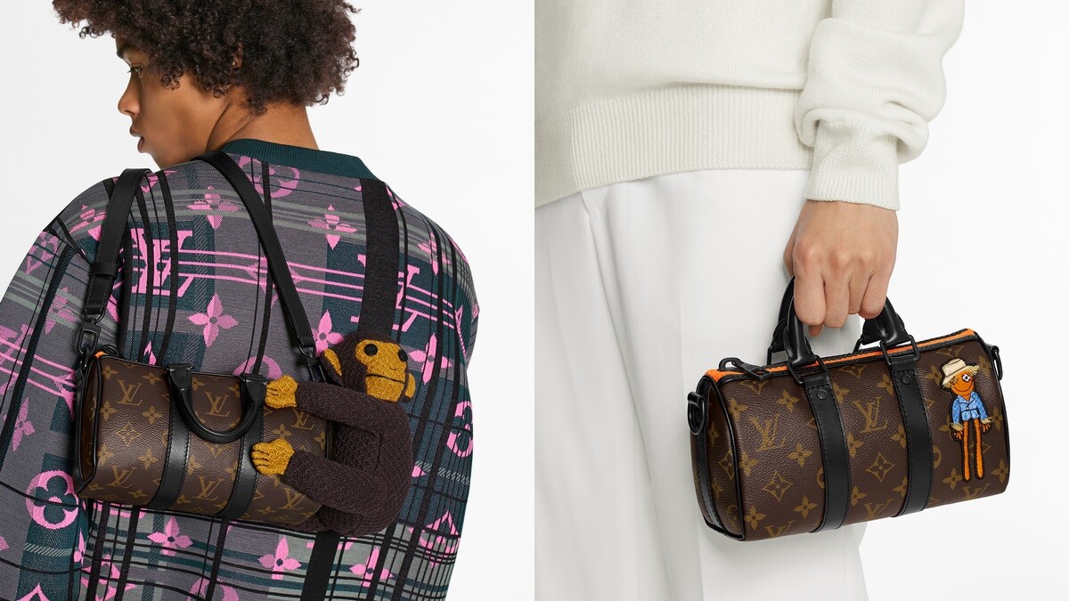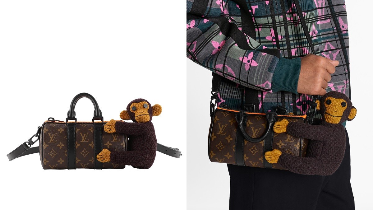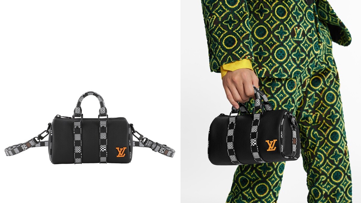 Louis Vuitton重新翻玩的Keepall與Steamer手袋共有4款,其中有3款為品牌經典圓筒包Keepall,分為有小動物猴子、吉祥物及黑色棋盤格圖案,圓筒包除了原本的手提把裝置,更附有可拆式肩帶,方便不同場合攜帶使用。