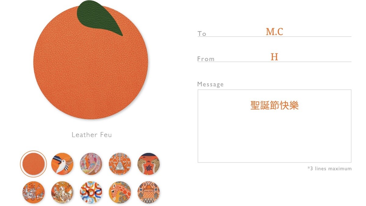 貼心的是,愛馬仕的聖誕賀卡可以親自挑選喜愛的圖案,並寫下送禮的對象及想對他說的祝福小語,內容最多可以寫滿三行,不限中、英文。完成後,Hermès小工匠就會把小賀卡裝進愛馬仕經典小橘盒,將滿滿的祝福送給對方,記得開啟鈴聲就可以聽見歡樂的耶誕歌。