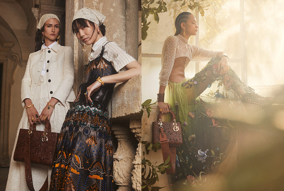 對紮染工藝著迷的 Maria Grazia Chiuri,在最新曝光的度假系列中,皆以獨特紮染圖案點綴服裝、配件及鞋履,在最新登場的2021早春度假系列中,採用夢幻玫瑰粉色系紮染印花,為經典包款Lady Dior換上新裝。