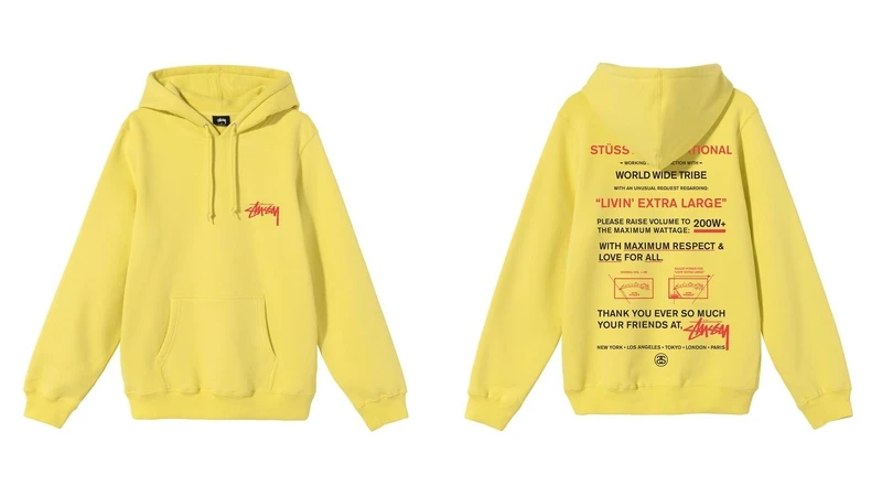Stüssy經典單品連帽T Shirt怎能錯過!寬鬆的版型搭配Pantone 2021代表色「亮麗黃」,衣服背後更印有紅、黑大寫的標語設計,展現滿滿潮味。另外也有素面的短袖T-Shirt、夾克...等。