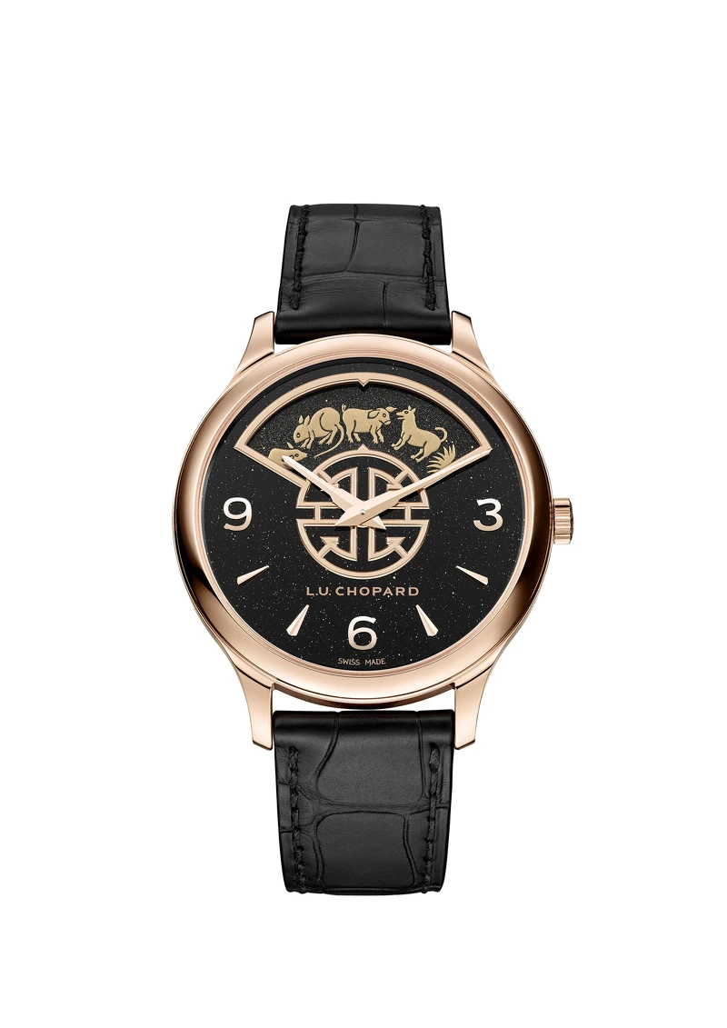 Chopard 蕭邦以蒔繪工藝(出自具有百年歷史的山田平安堂工坊,由漆藝大師小泉三教繪製。蒔繪工藝的特點之一,是在漆層之間灑入金箔。)和公平採礦認證18K玫瑰金打造,L.U.C XP Urushi Spirit of Shí Chen蒔繪腕錶的質感深色面盤中央綴飾的金色浮雕,是「福祿壽」三仙中「祿星」代表象徵;而上方扇形窗口則以轉盤顯示十二生肖動物—同時指示「時辰」,比如老鼠代表「子時」也就是晚上11點。
