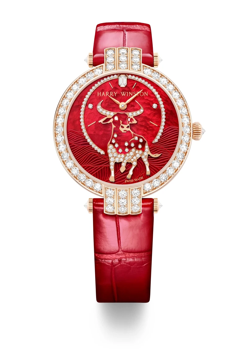 每年農曆年期間都值得期待!Harry Winston Premier系列手錶這次以紅色、牛年雙主題呈現:紅色珍珠母貝面盤、玫瑰金材質、部分鑲鑽…點出金牛的結實輪廓、雄壯犄角、面部表情,限量八只的卓時Premier系列牛年生肖36毫米自動手錶,另搭配飾有金色絹印的紅色漆盒。