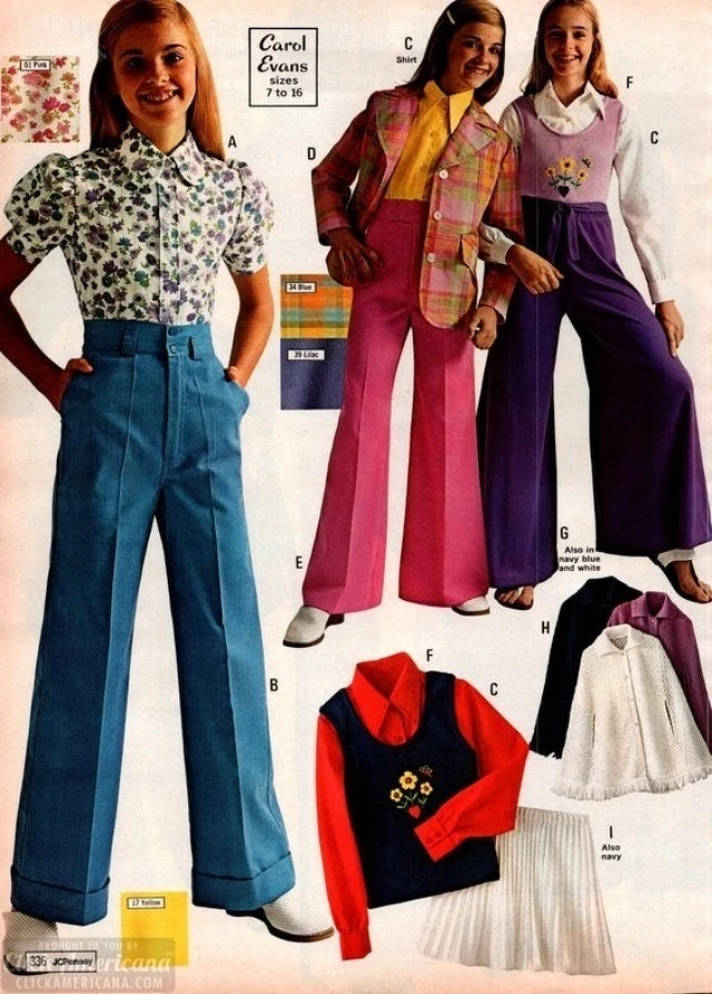 七零是個嬉皮的年代!喇叭褲、條紋等元素大為流行,我們可以選擇各種條紋單品,當然顏色可以非常鮮艷。若你想穿上大啦叭褲也可以,不過比較符合現代審美的選擇是最近比較流行的小喇叭褲,不過這也會讓整個復古造型有點「想要復古卻又不太到位」的感覺,就看你的選擇如何。