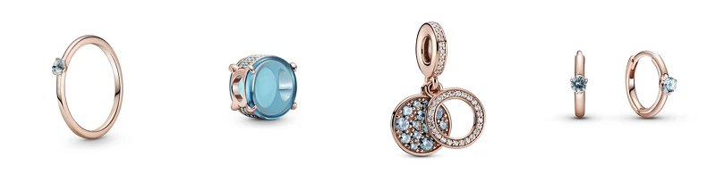 Pandora Rose天藍寶石線戒NT1,580、Pandora Rose天藍寶石串飾NT3,280、Pandora Rose閃耀恆星天藍寶石吊飾NT2,880、Pandora Rose天藍寶石單圈耳環NT2,080