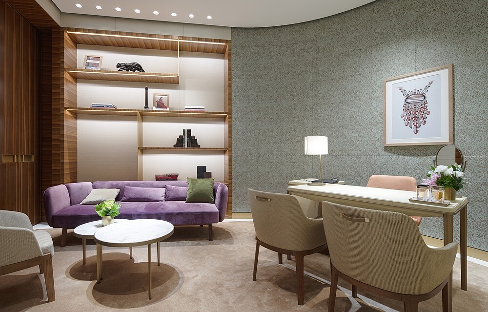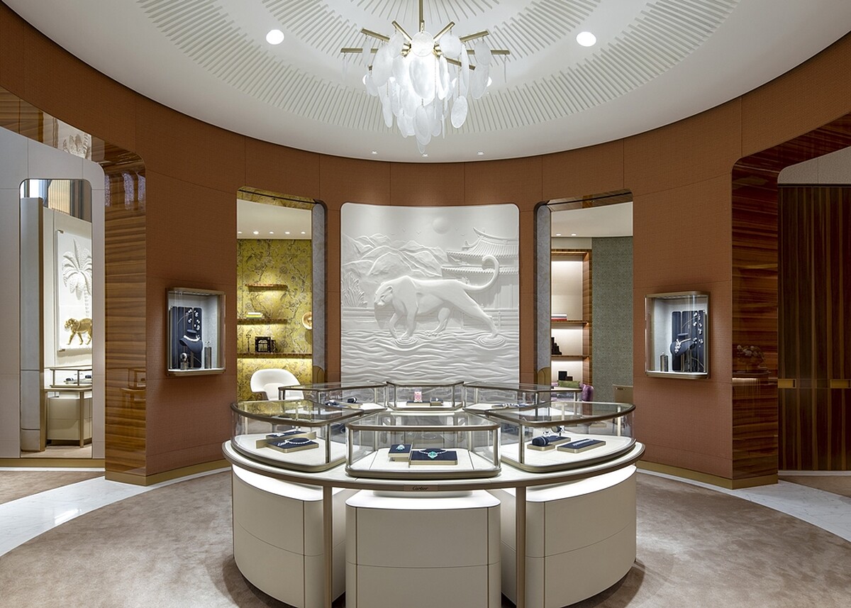 來自巴黎的工匠團隊Sofrastyl創立於1933年,曾為羅浮宮、巴黎東方文華酒店提供訂製服務,以細膩浮雕紋飾與石膏弧面等藝術技法見長。此外,此珠寶專區搭配英國品牌CTO LIGHTING所設計的Nimbus吊燈,以手工玻璃彷造貝殼質感。