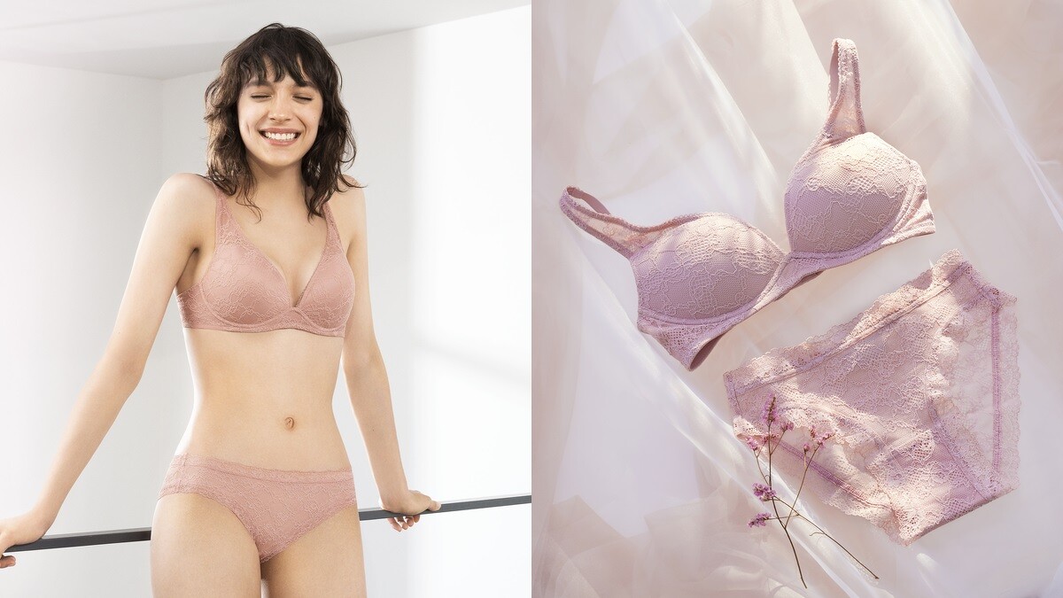 Uniqlo無鋼圈美型胸罩(托高集中)透過獨特交叉支撐結構,托高胸圍上半部打造性感溝線,罩杯邊緣採用樹脂材質彈性內襯,可以防止胸型外擴,將胸部完整包覆於罩杯內,維持漂亮胸型。同步推出成套蕾絲內褲,提供女孩們搭配選擇。