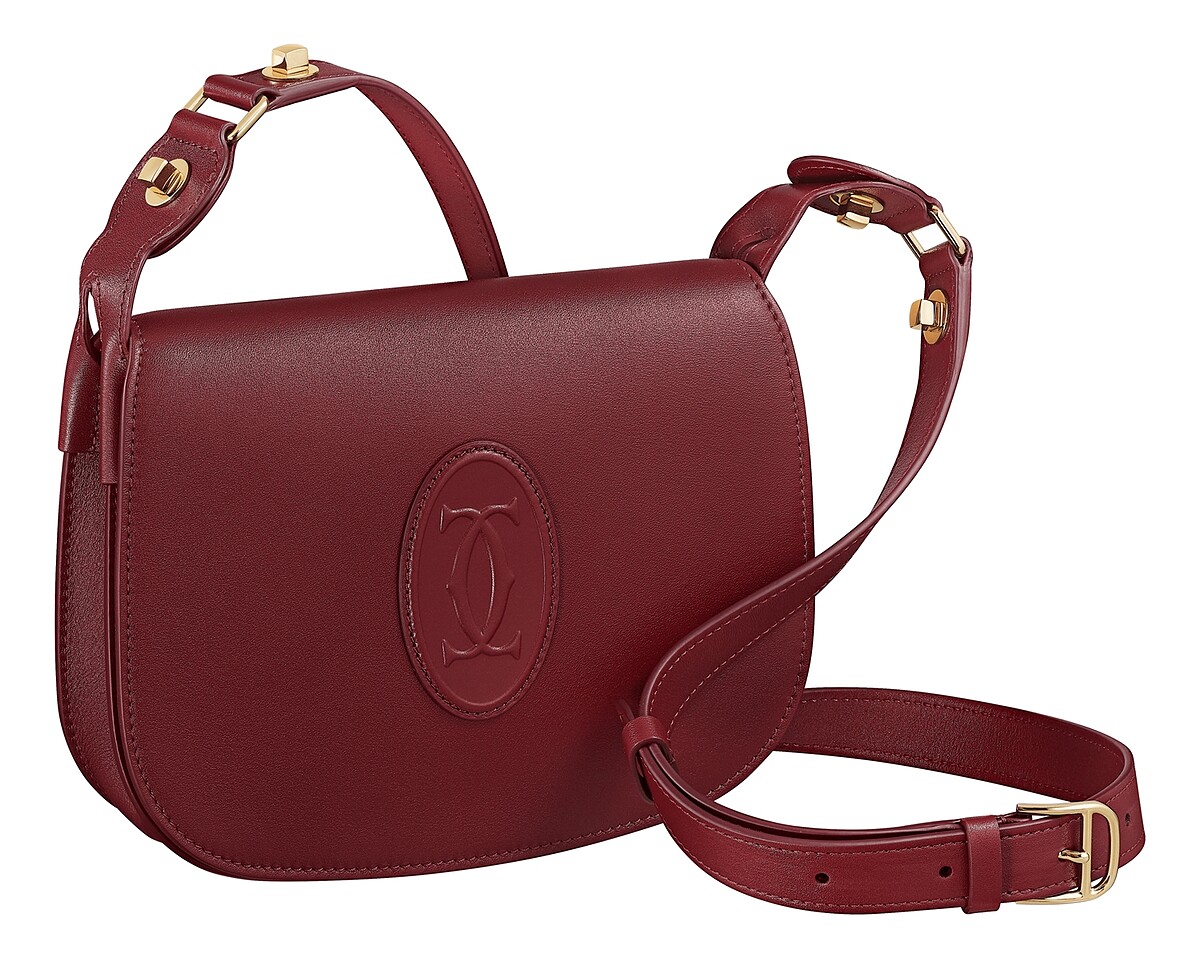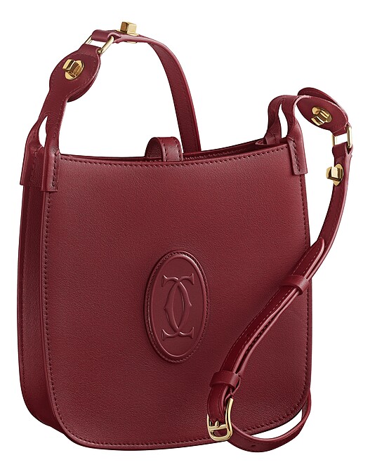 ↑ Must de Cartier狩獵包酒紅色小牛皮,Cartier標誌徽章,酒紅色小羊皮襯裡。可調校式肩帶,點綴金色鍍層飾面細節,可肩揹或斜揹。