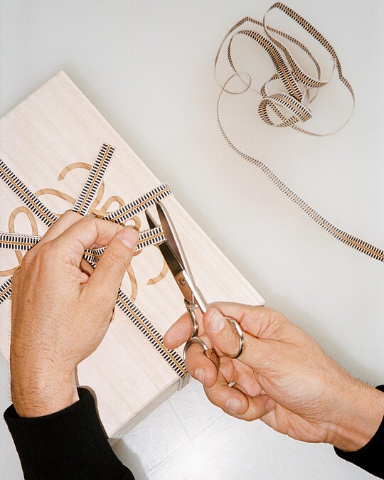 禮盒外繫上的緞帶,則是來自日本的另一種工藝,稱之為「真田帶」,因為其堅韌、耐用的特性,古代日本武士多用於綑綁劍柄和武器,爾後也衍生出其他用途。