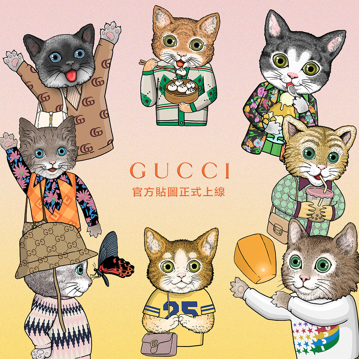 為了歡慶Gucci 台灣LINE官方帳號正式開通,只要加入Gucci的LINE好友,就能免費下載個性小貓貼圖,討喜的貓咪們特別換上結合台灣元素的可愛造型,以及Gucci BELOVED系列中為人熟知的經典作品,十分俏皮。即日起到4月1日前都能 免費下載 。