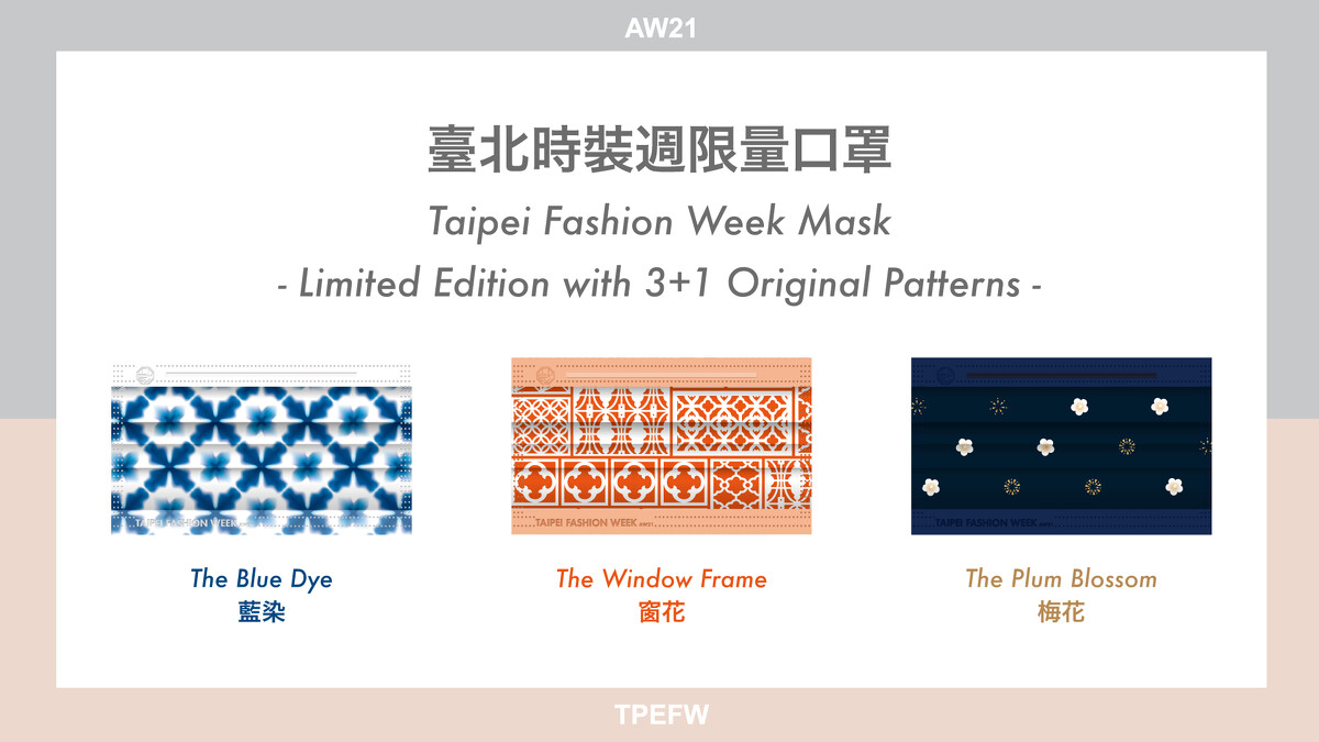 防疫期間為了讓臺北時裝週順利進行,將於中衛再次攜手合作,以民族編織、傳統窗花、藍染和梅花等文化元素為主題,獨家推出四款充滿台式風格的主題花色口罩。