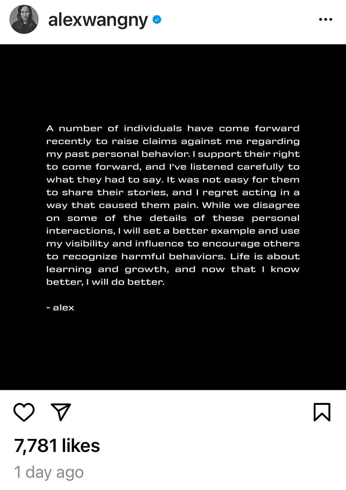 根據《WWD》報導,受害者代表律師Lisa Bloom聲明:「我們已和Alexander Wang與其團隊碰面。我的客戶們有機會向Alexander Wang本人闡述他們內心的痛苦與感受,也接受王先生的道歉並和解,這件事就在此告一段落。」