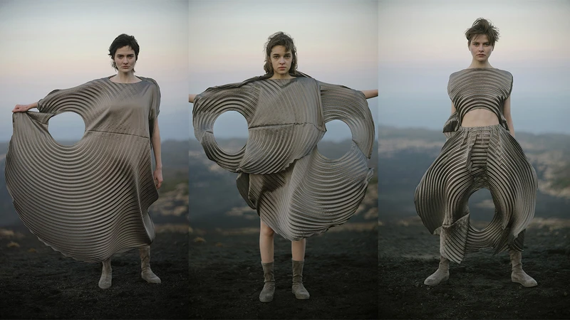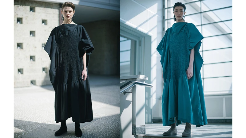 此手工壓褶系列加上圓形輪廓呈現服裝特色,開口和同心圓相互壓褶,每件服裝可以沿著壓褶線褶疊成緊密的尺寸,從平整的線條變成彎曲的立體形式,強烈戲劇張力的吸睛度令人驚艷其創作空間,共有淺灰色、深灰色和黑色三種顏色可以選擇。
