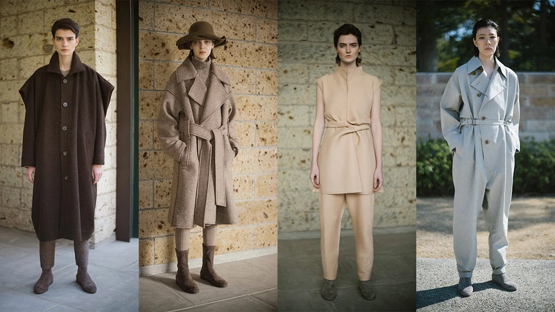 使用未染色的纖維來保留原始的顏色和紋理,環保有機的羊毛材質打造製作出大衣單品,獨特衣袖可以褶疊成方形,結合自然棕和綠色棉,彰顯出前衛且高級的樣貌。